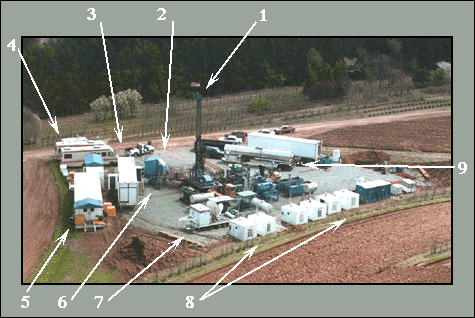 1, Diamond-bit coring rig with well control and closed circulation drilling fluid system; 2, Control cab for coring rig; 3, Computerized engineering shed for monitoring drilling operations; 4, Mobil homes for housing the Amoco drilling managers and engineers on-site on a 24-hour basis; 5, Geological modules in which core preparation (cutting into 3 ft lengths and boxing) was carried out along with the collection of the core description, digital images, and geophysical measurements; 6, Water well (not visible) for on site drilling water; 7, Satellite dish for voice and telemetric communication; 8, Electrical generators for power; 9, Tanker truck for drilling fluids.
