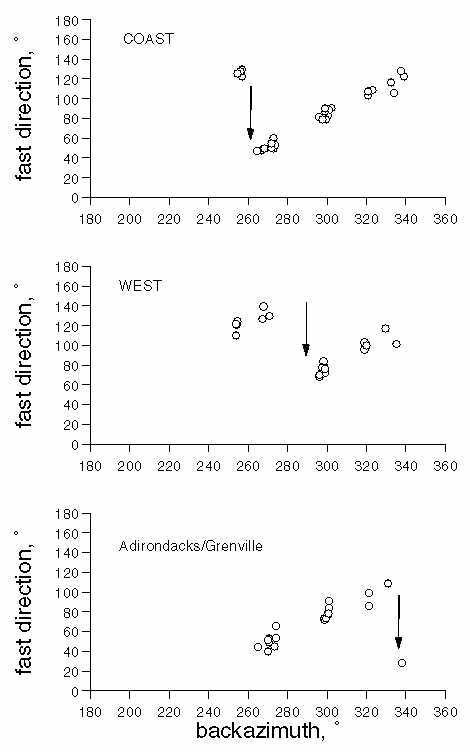 Figure 10. Regional variation in the pattern of fast direction change with backazimuth.