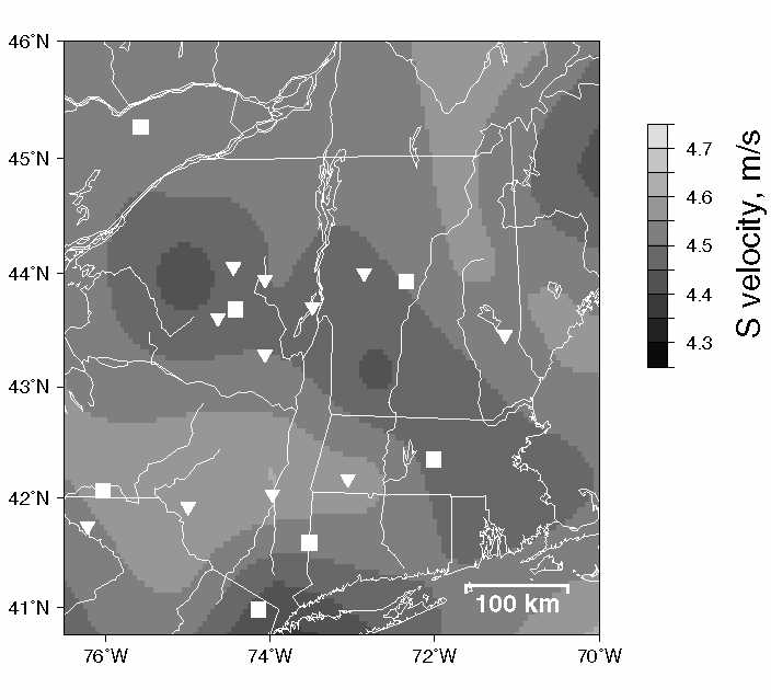of the tomographic model (100 - 200 km deep). Velocity varies by