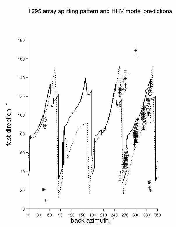 . Predicted patterns of fast direction variation for two-layer models with hexagonal (dashed line) and orthorhombic (solid line) symmetries match the observations. The model was developed for station HRV [Levin et al., 1999], and is presented in Table 3. (Postscript Version).