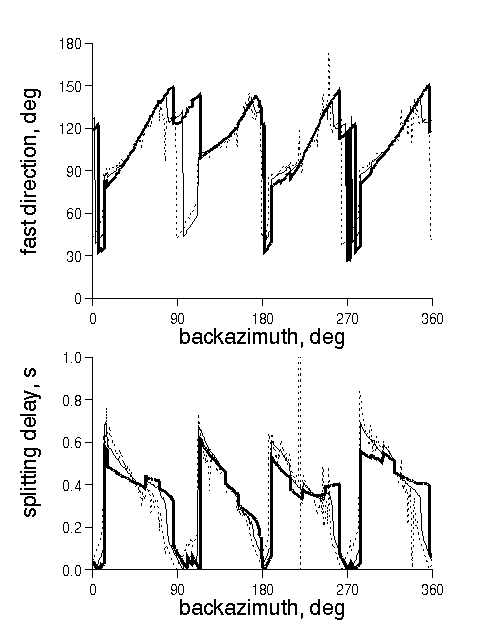 Fig. 4. Influence of the filtering applied to the synthetic waveforms on the apparent splitting parameters. Waveforms are simulated in a 2-layer model developed for station HRV (see Table 2). Apparent splitting parameters measured from waveforms with an upper spectral limits of 0.45Hz (bold), 0.35Hz (solid) and 0.15Hz (dotted) are shown, with a lower limit of 0.05Hz common for all. For all cases tested the estimate of the apparent fast direction tends to vary greatly when the delay is the smallest. The lowest bandpass (0.15Hz) gives most unstable results throughout. (Postscript version)