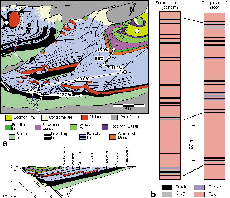 | Figure 1: a. Geologic map of the north-central part of the Newark basin showing the locations of the seven NBCP drill sites. Schematic cross section shows offset coring technique; marker unit at the base of one core correlates with same marker unit at top of adjacent core. Arrows on geologic map indicate the amount of thickening between overlap sections of stratigraphically adjacent cores based on correlations in Olsen et al. (1996a). Abbreviations for drill holes are: M, Martinsville; N, Nursery; P, Princeton; R, Rutgers; S, Somerset; T, Titusville; W, Weston. Other abbreviations are: F=Flemington fault; f=Ferndale folds; H=Hopewell fault; w=Watchung syncline. b. Overlap section of the Rutgers and Somerset cores, showing pronounced increase in thickness and proportion of deeper-water mudstones (gray and black units) from Rutgers to Somerset. Based on data in Olsen et al. (1996a). |