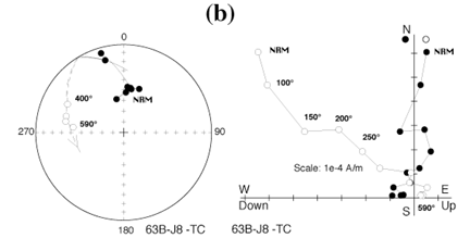 | Typical thermal demagnetizations diagrams of Early-Middle Jurassic sandstones of Irkutsk coal basin. It shows well the presence of normal and reversed polarities (a). Plot (b) shows great circle analysis. Zijderveld plots are in tilt-corrected coordinates; closed/open symbols are projections onto the horizontal/vertical plane; temperature steps are in degrees C. From Kravchinsky et al. (1999). |