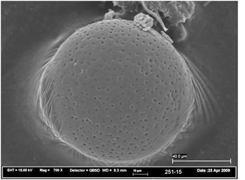 Twelve carbon-rich spherules or tecktites were found throughout the Tamarack Pond samples, with both smooth and pitted (above) surfaces. Carbon spherules could be the result of impact origin, forest fires, or a more unlikely cause would be from pollution. The disparity in the samples might indicate more than one mechanism is responsible for their presence in Tamarack Pond. Imaged using a Scanning Electron Microscope (SEM). |