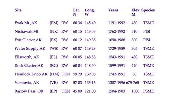 Temperature-sensitive tree-ring chronologies used to model the annual Pacific Decadal Oscillation index. AK = Alaska, OR = Oregon. DEN = Density, RW = Ring width. Barlow Pass data from K. Briffa and F. Schweingruber. Hemlock Knob series from D. Frank. TSME= mountain hemlock, PISI = Sitka spruce, PSME = Douglas Fir. Shorter NK, WS and HM series deleted from longer reconstruction.