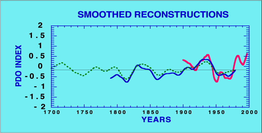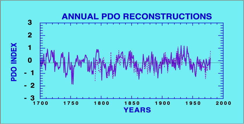 PDO reconstruction (dashed) from 1790-1979 based on the 9 tree-ring series and 2 PDSI series. Three of the shorter tree-ring chronologies were eliminated to develop a longer alternative model (solid) going back to 1700.