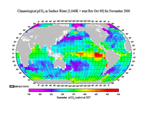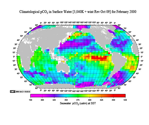 These maps show the mean pCO2 at Sea Surface Temperature for each 4°x5° Box for each of the 12 months. The values are estimated for the year 2000 and were revised in June 2009.