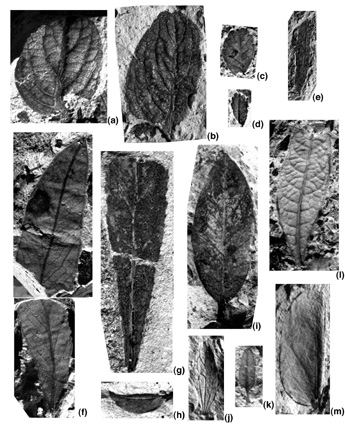 Photos of leaf forms, x 4 except where noted. (a) Form 1, specimen 96.22 (x 5). (b) Form 1, specimen 96.1. (c) Polylepis sp., specimen 96.198. (d) Polylepis sp., specimen 96.432. (e) Form 6 (legume 2), specimen 96.329. (f) Form 4, specimens 96.159 a and b. (g) Form 8, specimen 96.30. (h) Form 10, specimen 96.70. (i) Form 12, specimen 96.40. (j) Form 14 (Berberis), specimen 96.215. (k) Form 17, specimen 96.142. (l) Form 3, specimen 96.7. (m) Form 5 (legume 1), specimen 96.441.