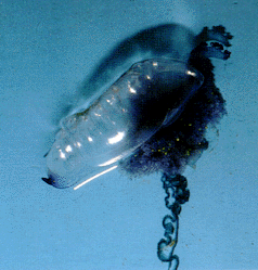 Although the sting of most cnidarians is harmless to humans, that is not true of the group of hydrozoans called the "man-of-war", such as the Pacific man of war Physalia utriculus which superficially resembles a jellyfish. However a jellyfish is a single polyp while a man of war is a colony of individuals specialized to do different tasks much like tissues. The reaction of a human to the sting of a man-of-war varies from local pain that passes quickly, to severe reactions that can be fatal. Occasionally they are washed on shore my the millions. Otherwise they are quite rare near shore. |