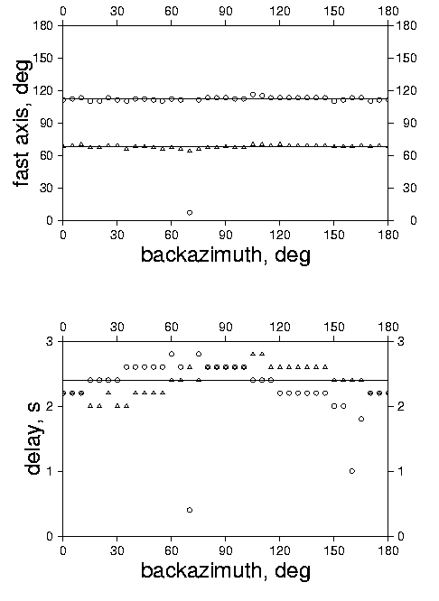 Fig. 6. Results of 2 layer fit to 2 layer synthetics. Top: Estimated fast axes for individual seismograms (circles and triangles) and group (solid lines). Bottom: Estimated splitting delay. |