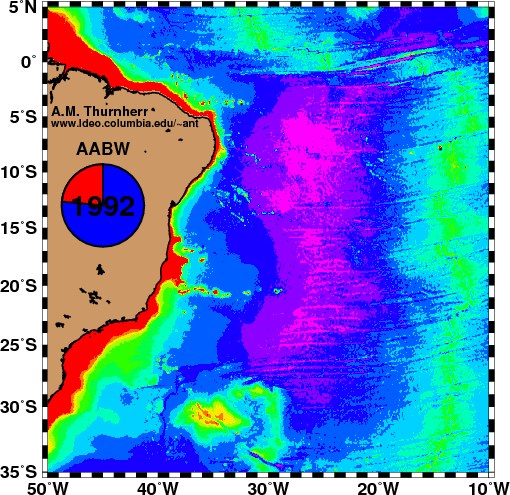 During the DBE, several hundred acoustically tracked neutrally buoyant floats were deployed in Antarctic Intermediate Water (AAIW, 600-1350m), North Atlantic Deep Water (NADW, 2000-3000m) and Antarctic Bottom Water (AABW, > 3000m). The DBE float data are publicly available from the WOCE Float DAC. Below, there are links to 3 gif-animations showing the float data sub-sampled every 4 days. Trajectory gaps shorter than 20 days are filled with cubic splines; the floats "disappear" during longer gaps. [Decent web browsers should be able to display the animations correctly (one full year should take 6.4s), it may be advisable to download the animations and display them using other viewers. For example, the MacOSX the QuickTime Player is a good gif-animation viewer and individual frames can be inspected with Preview.]