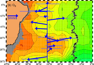 One particular result inferred from the DBE data is that the flow at the level of North Atlantic Deep Water is primarily zonal (Hogg and Owens, DSR, 1999). Furthermore, Thurnherr and Speer (JMR, 2004) show that the temporally averaged floats measurements in the interior of the Brazil Basin are consistent with patterns in several tracer fields, as illustrated in the case of oxygen at 2500m in the figure on the right. (A hydrographic and tracer climatology of the tropical and subtropical South Atlantic can be found here.)