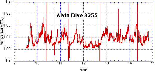 The second two thirds of the dive consisted of three additional traverses of the axis. The two west to east traverses each reached sediment cover age 3 lavas near or at the top of the east wall of the valley, whereas the east to west traverse stopped at mid elevation on the western wall. Much of the geology on the upper and middle elevation reaches of the valley walls was the same as observed on the first dive traverse (from way point 1 to 2). However, on all 3 of the latter crossings, the valley floor was filled with significantly younger appearing lavas of sediment cover age 1.5. These lavas were primarily pillow constructs on track legs 2 and 3, whereas track leg 4 crossed pillows transitional to lobates. In each case, some fissuring was evident in the western reaches of these younger lava constructs. One lava was sampled from each of these crossings (samples 3355-4, -7 and -9) and were found to have distinctive mineralogy (olivine and plagioclase phenocrysts) and much less surficial alteration than those found on the valley floor on dive leg 1 (sample 3355-2) or on the valley walls (samples (3355-1, -3, -5, -6, -8, -10, -11).