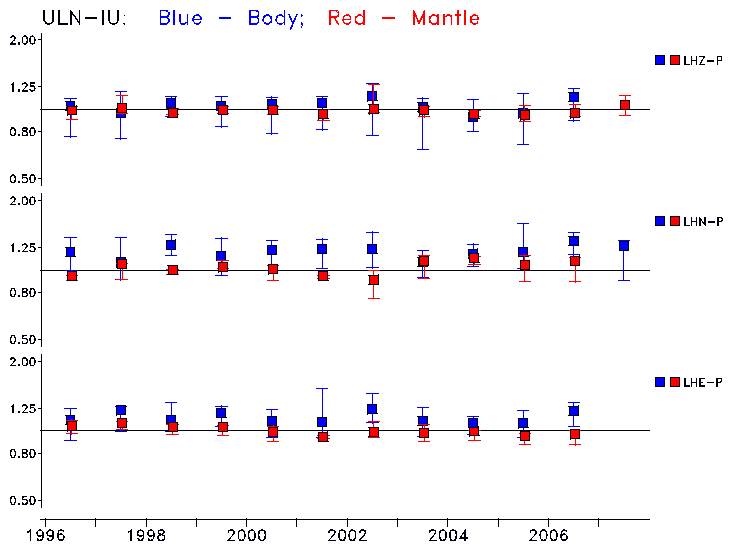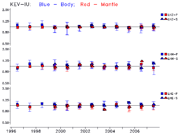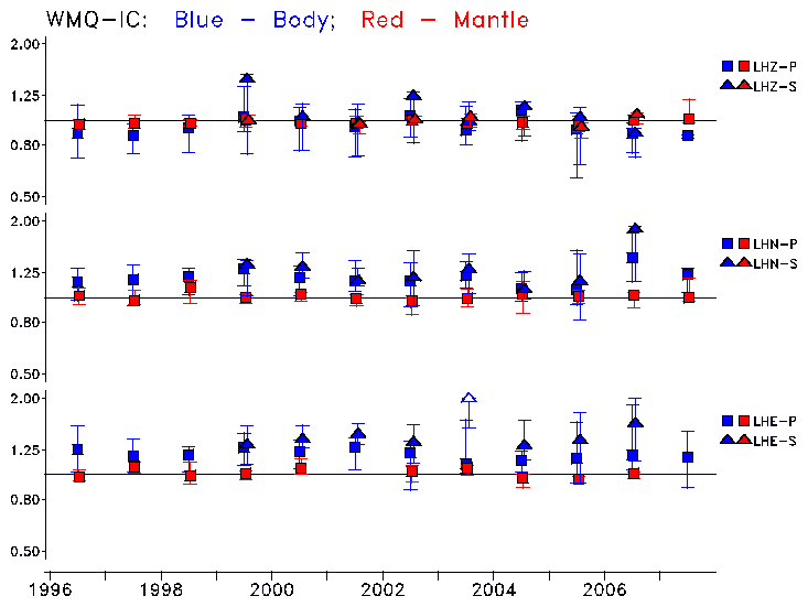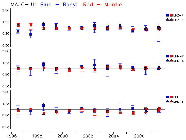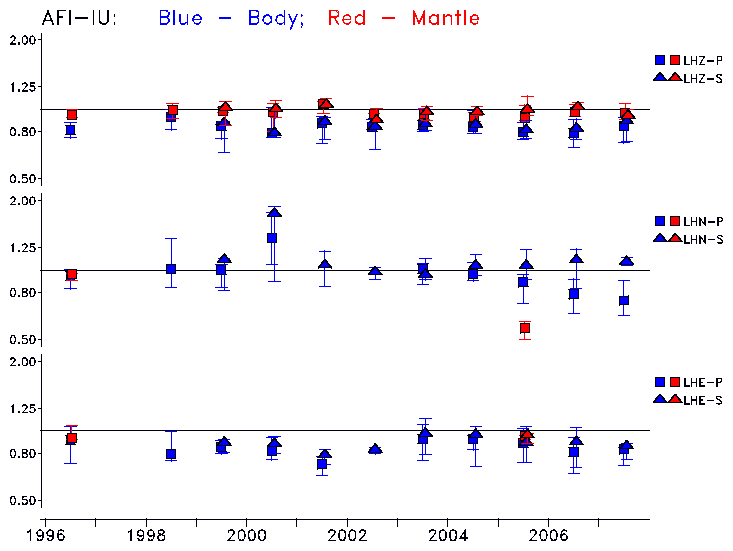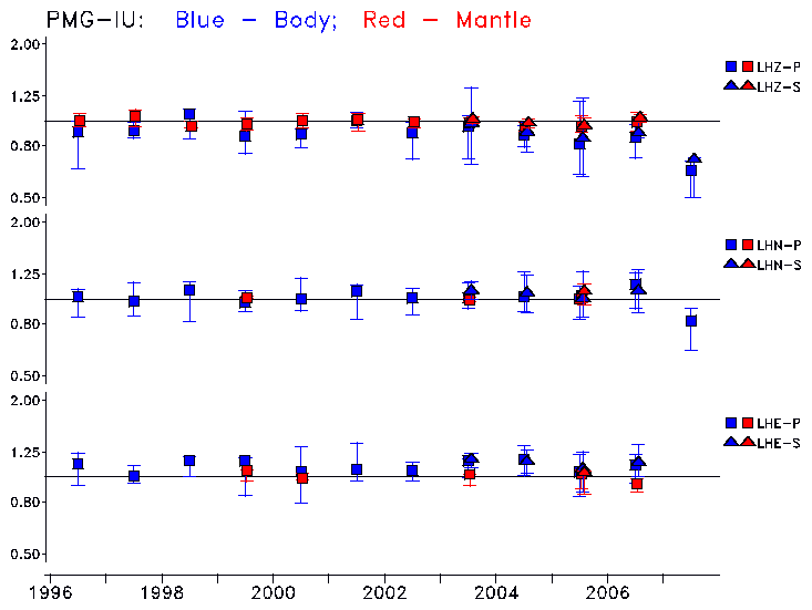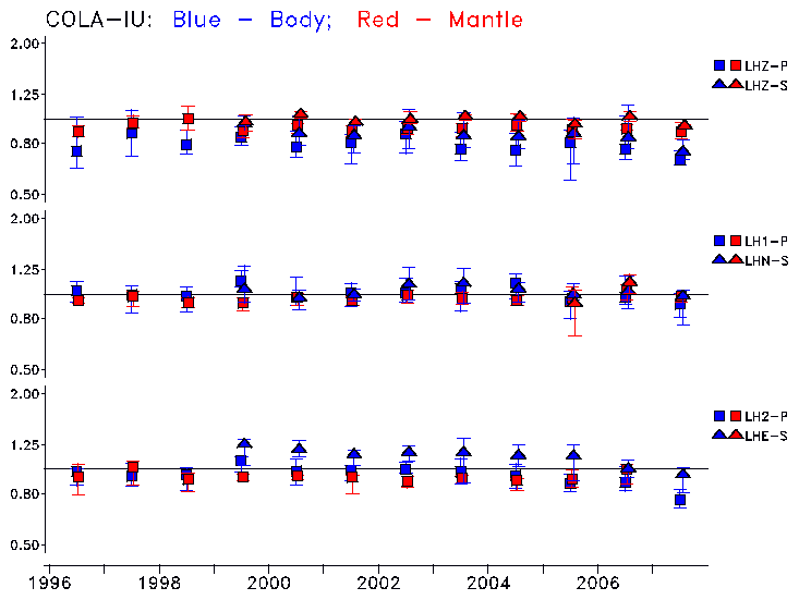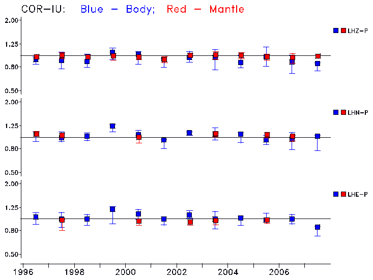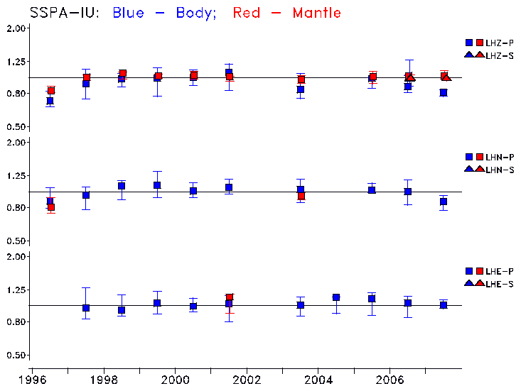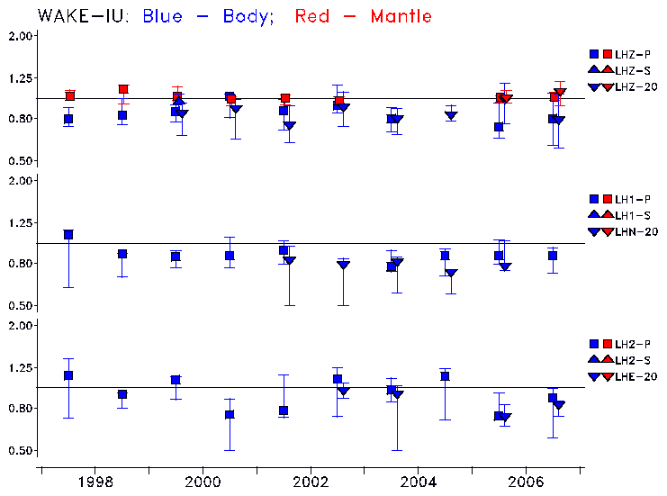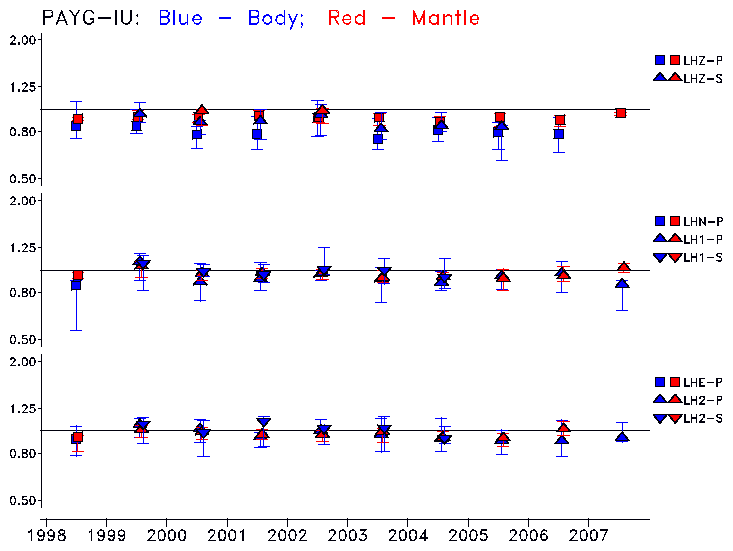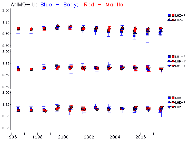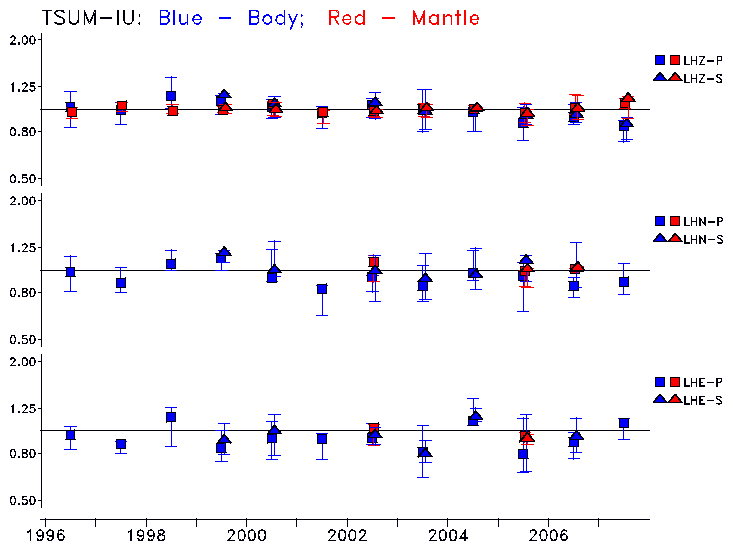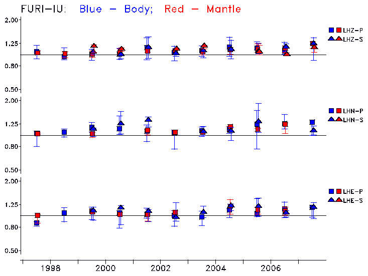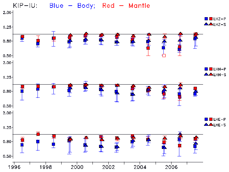 Earthquakes larger than M=6.5 are included in the analysis. Standard time windows are selected, and corresponding synthetic seismograms calculated For seismograms that have a correlation greater than 0.75, an optimal scaling factor (the factor by which the synthetic should be scaled to best match the observed seismogram) is calculated. A median scaling factor for each year is also calculated and displayed, together with limits for the two central quartiles.