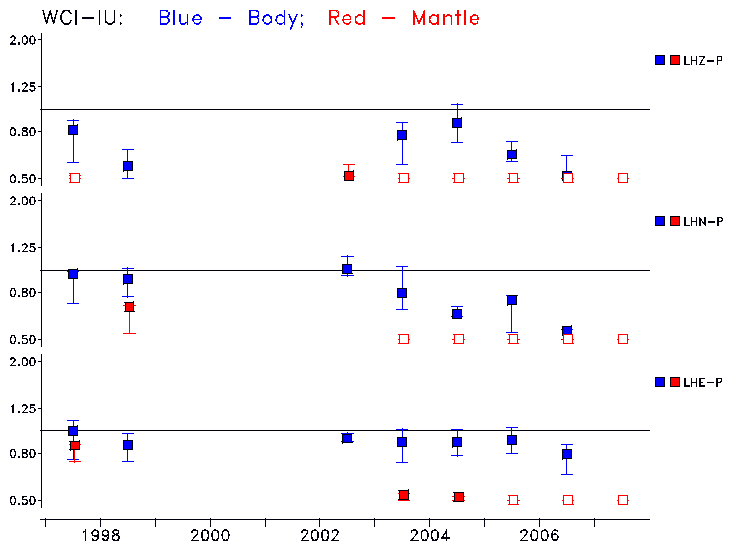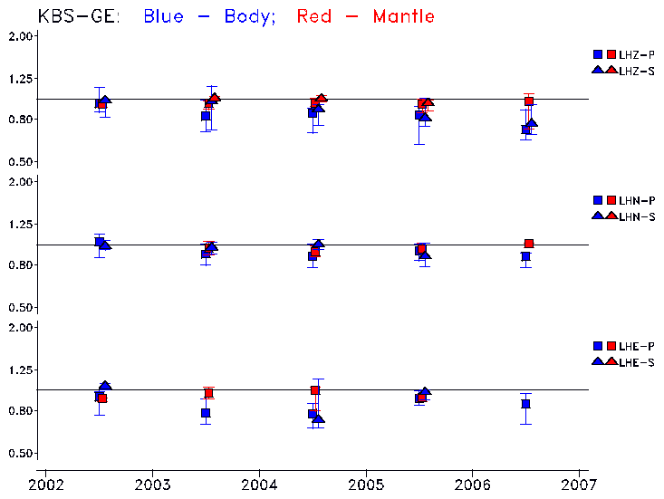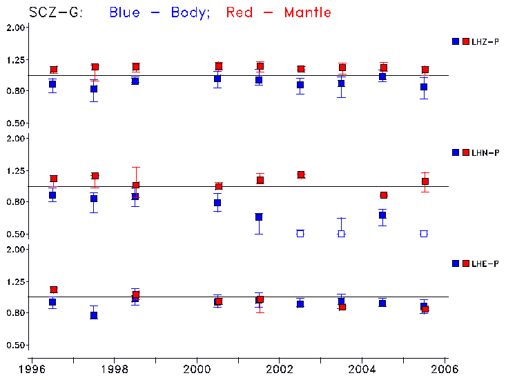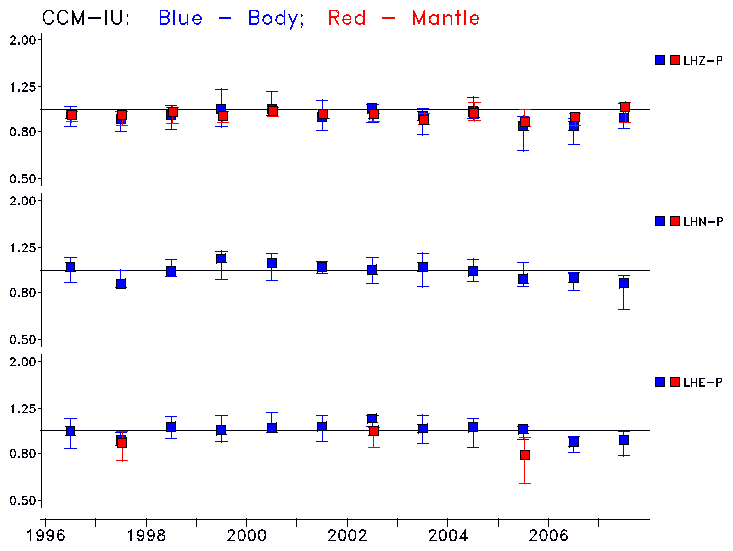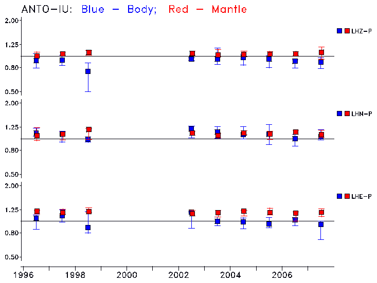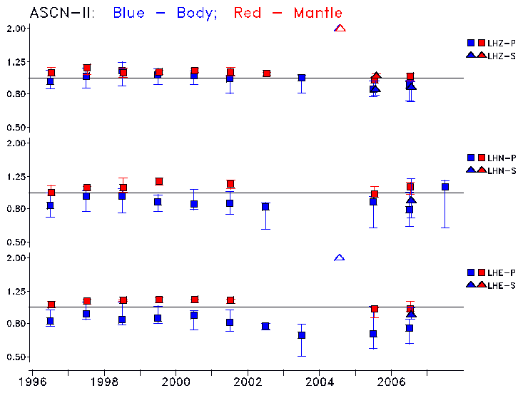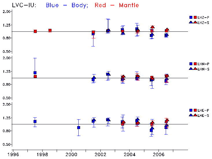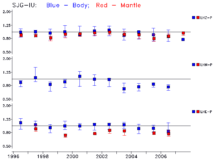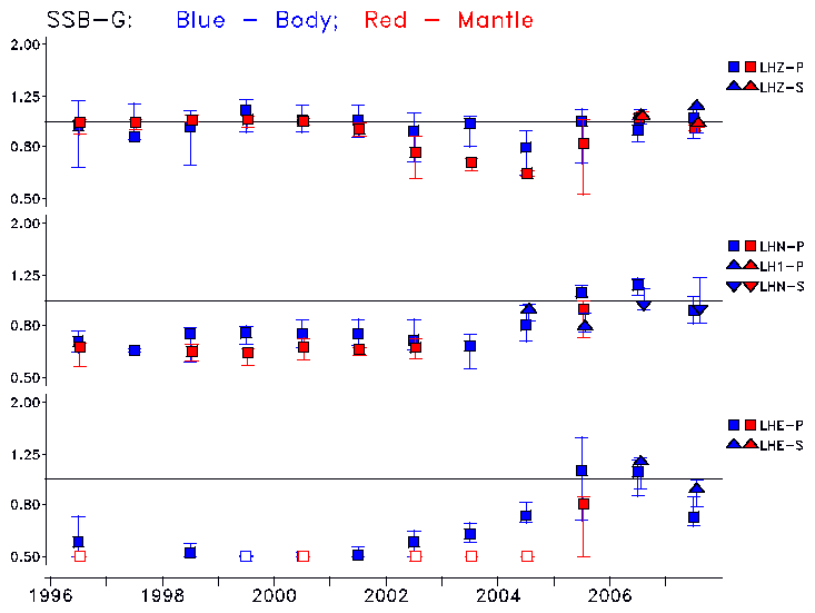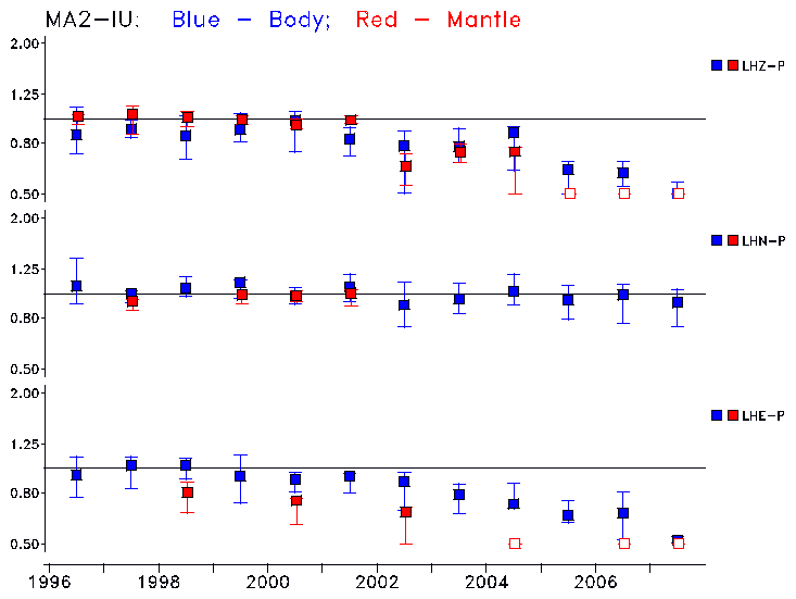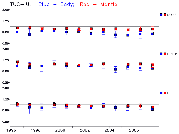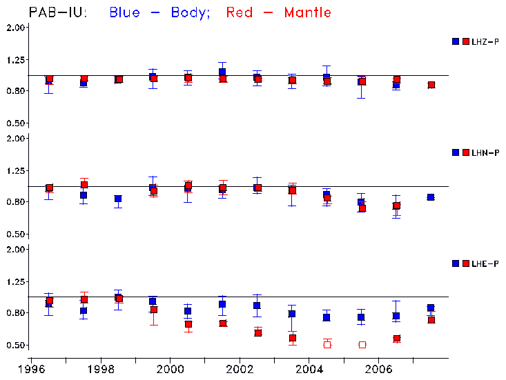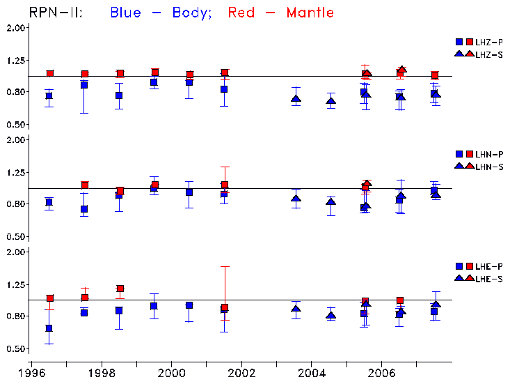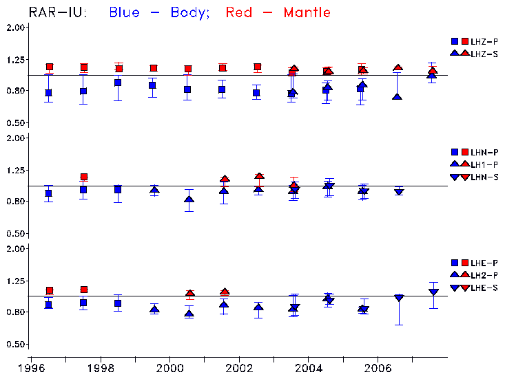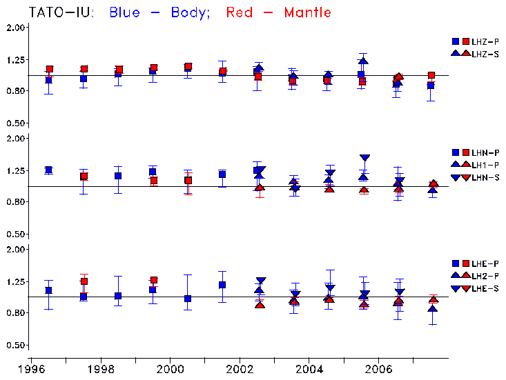 Earthquakes larger than M=6.5 are included in the analysis. Standard time windows are selected, and corresponding synthetic seismograms calculated For seismograms that have a correlation greater than 0.75, an optimal scaling factor (the factor by which the synthetic should be scaled to best match the observed seismogram) is calculated. A median scaling factor for each year is also calculated and displayed, together with limits for the two central quartiles.