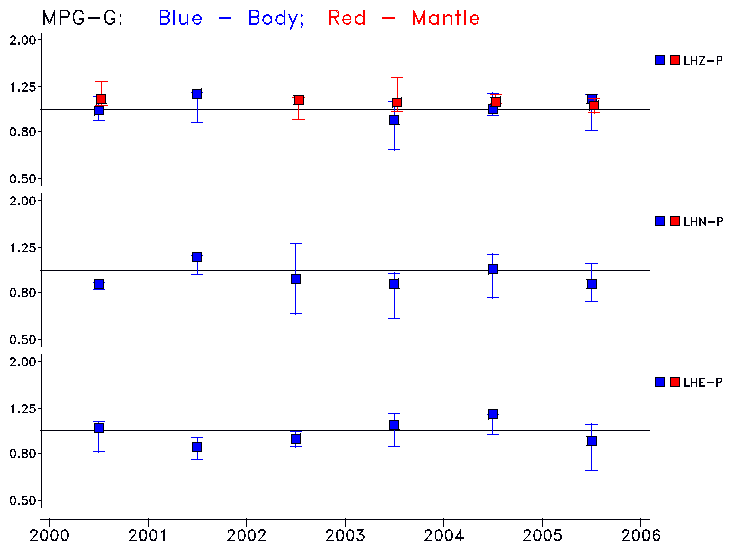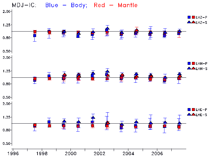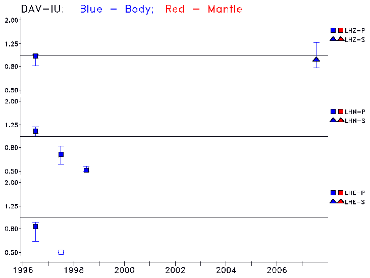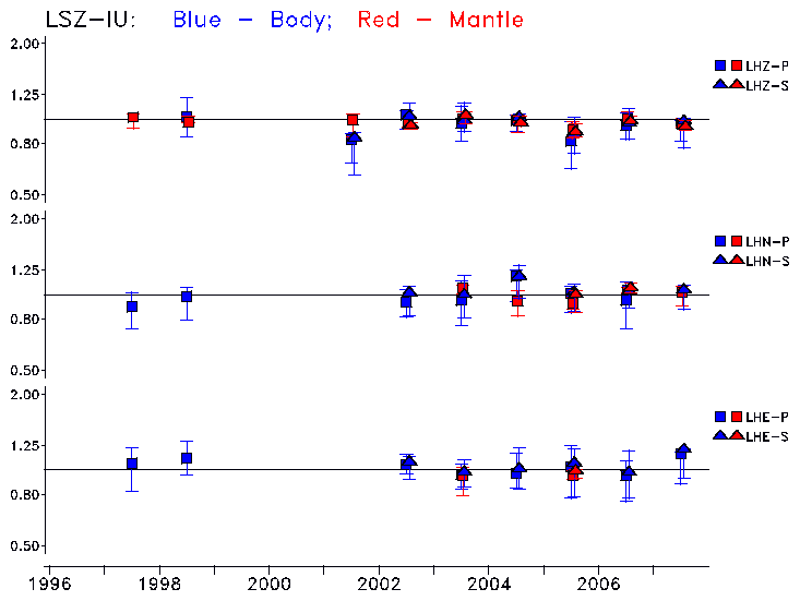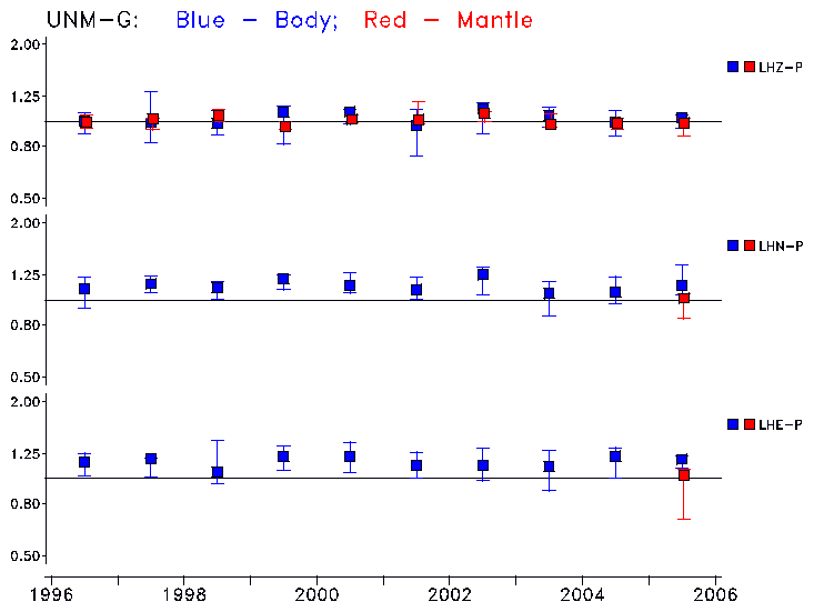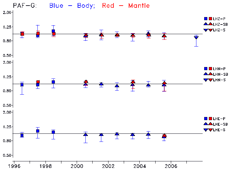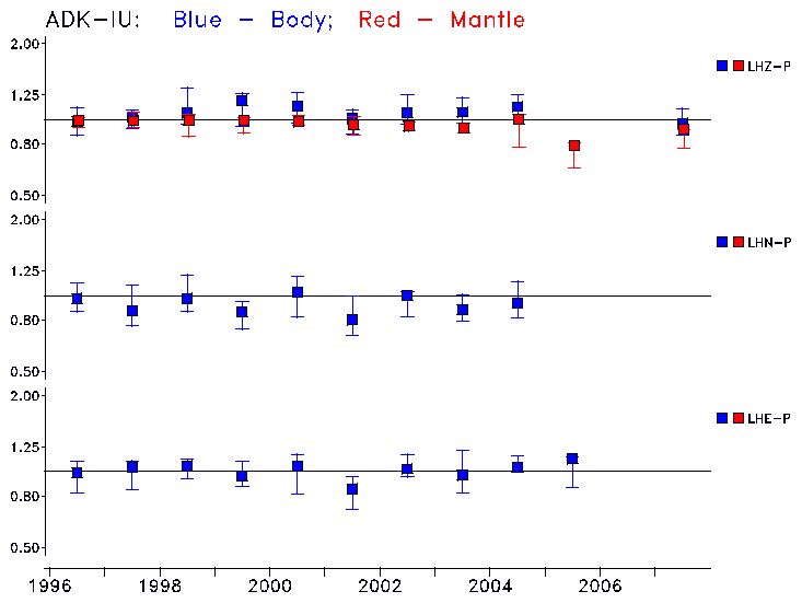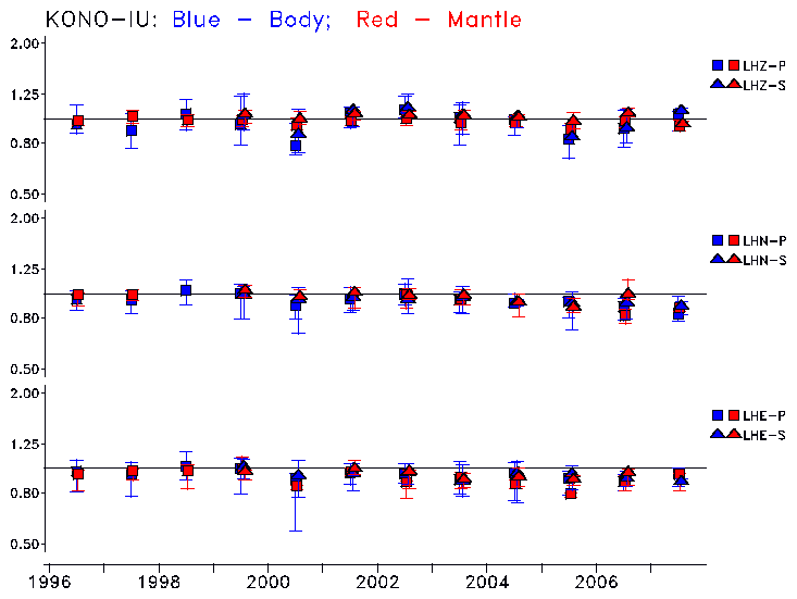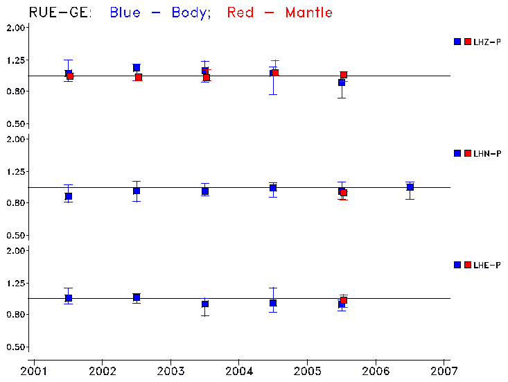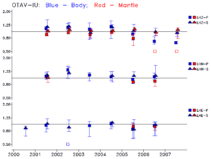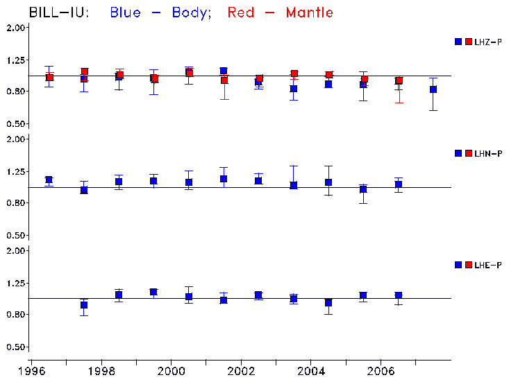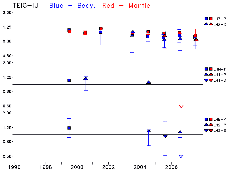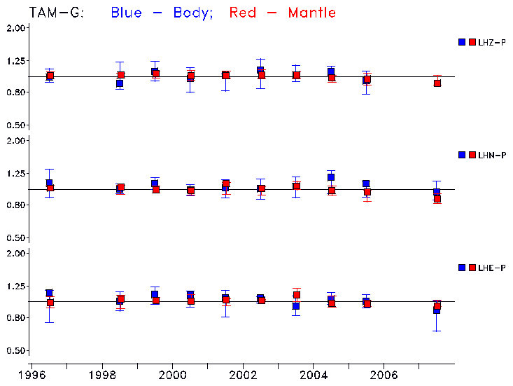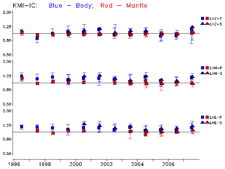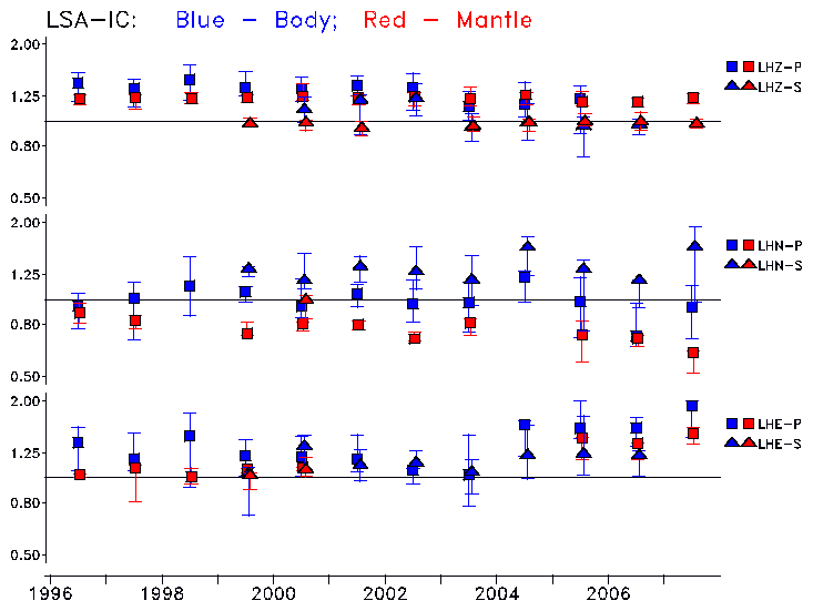 Earthquakes larger than M=6.5 are included in the analysis. Standard time windows are selected, and corresponding synthetic seismograms calculated For seismograms that have a correlation greater than 0.75, an optimal scaling factor (the factor by which the synthetic should be scaled to best match the observed seismogram) is calculated. A median scaling factor for each year is also calculated and displayed, together with limits for the two central quartiles.