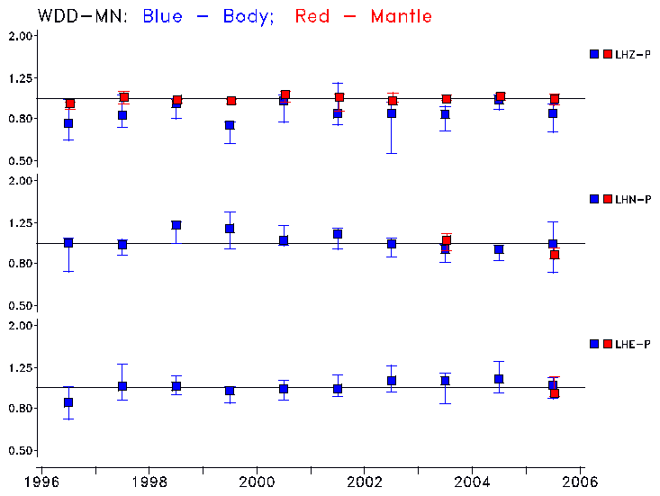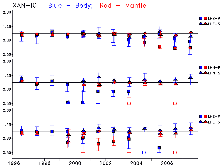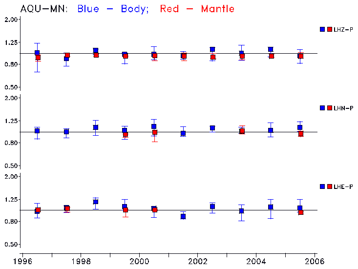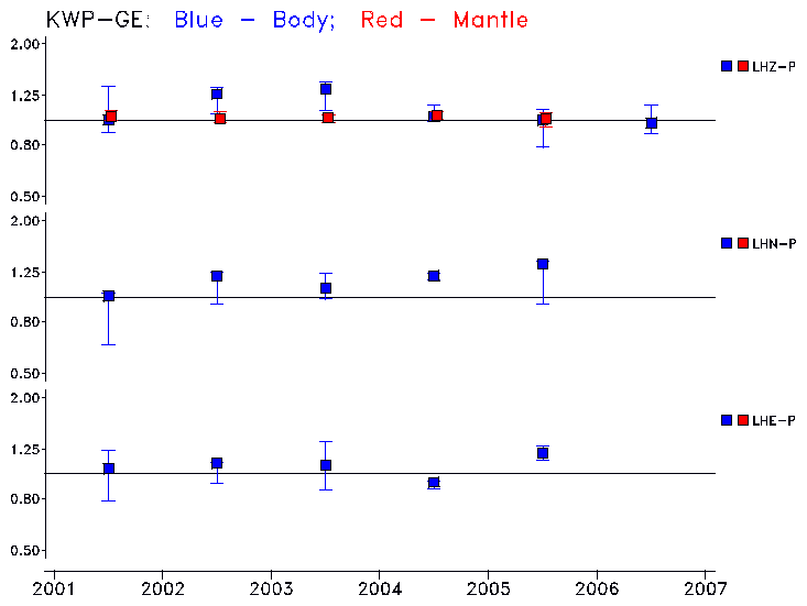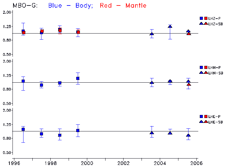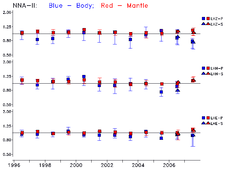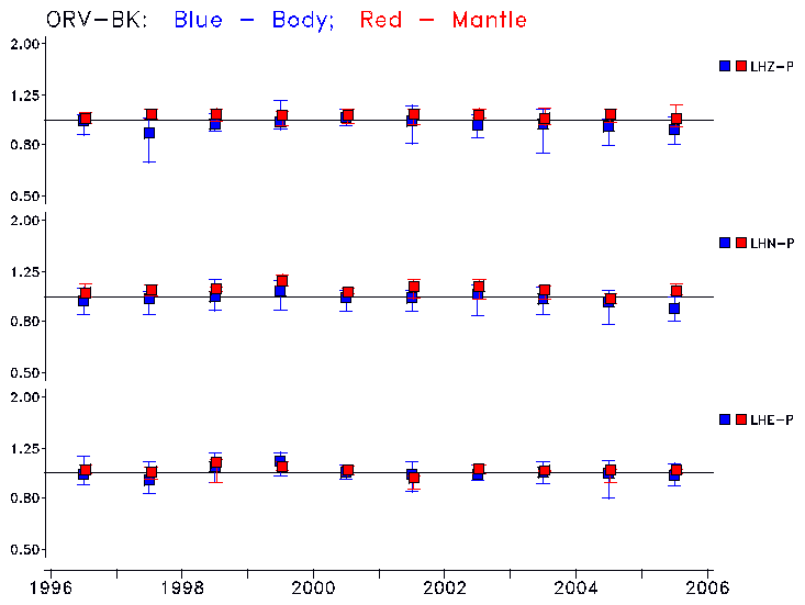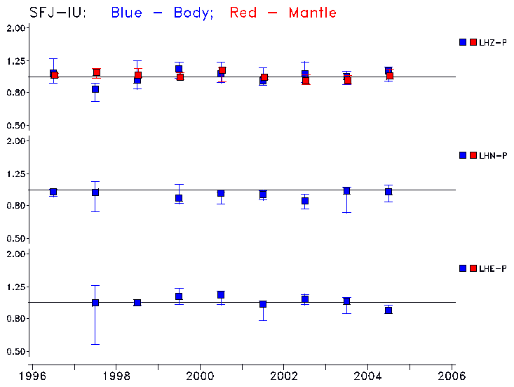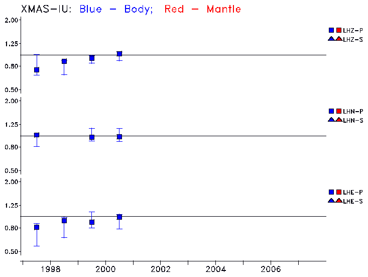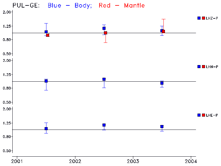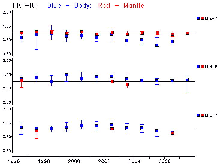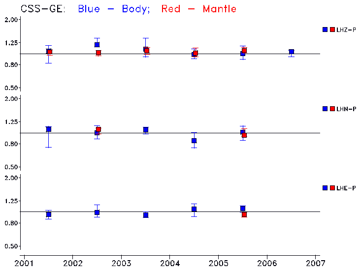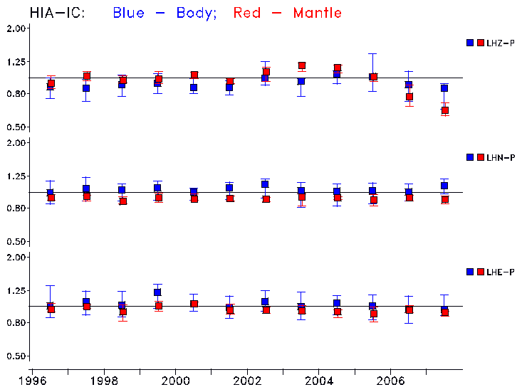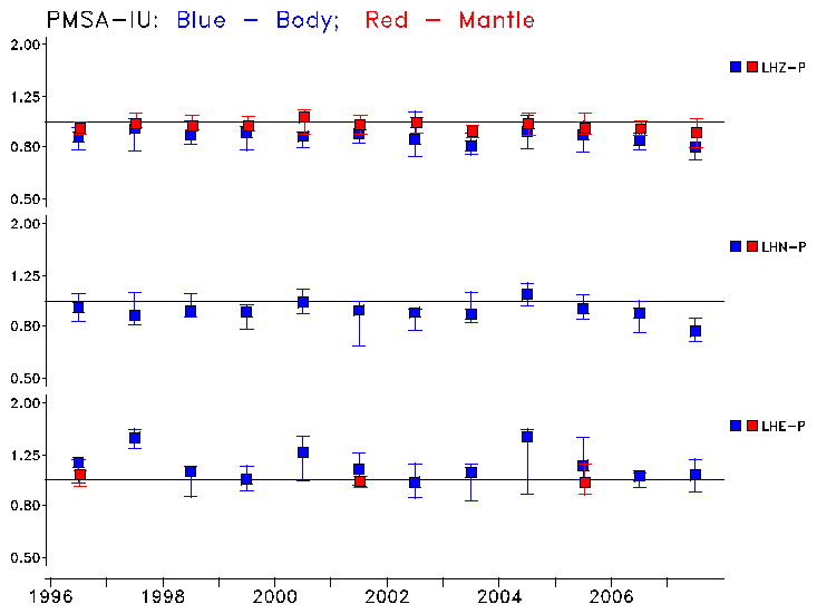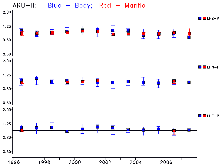 Earthquakes larger than M=6.5 are included in the analysis. Standard time windows are selected, and corresponding synthetic seismograms calculated For seismograms that have a correlation greater than 0.75, an optimal scaling factor (the factor by which the synthetic should be scaled to best match the observed seismogram) is calculated. A median scaling factor for each year is also calculated and displayed, together with limits for the two central quartiles.