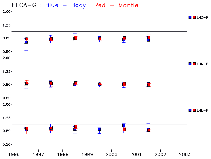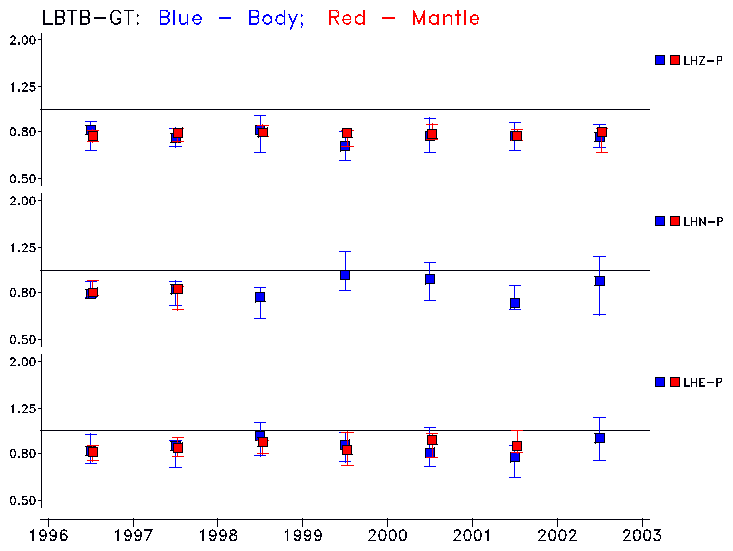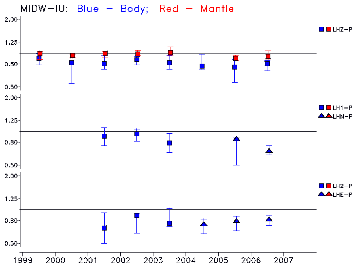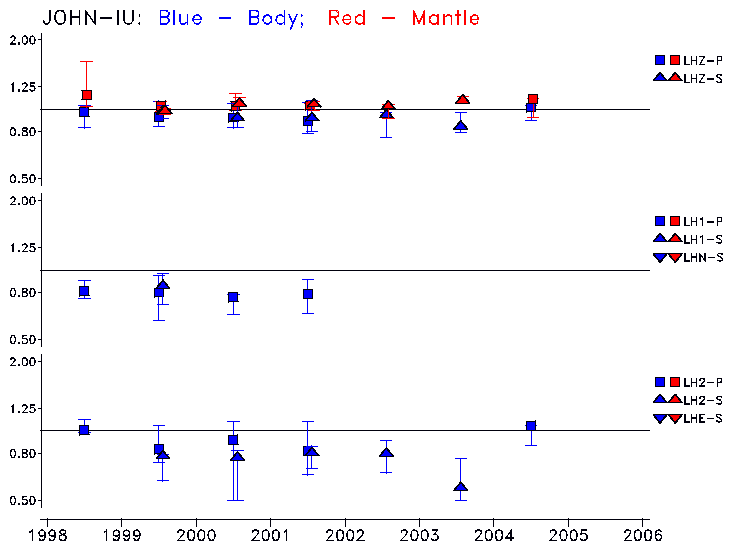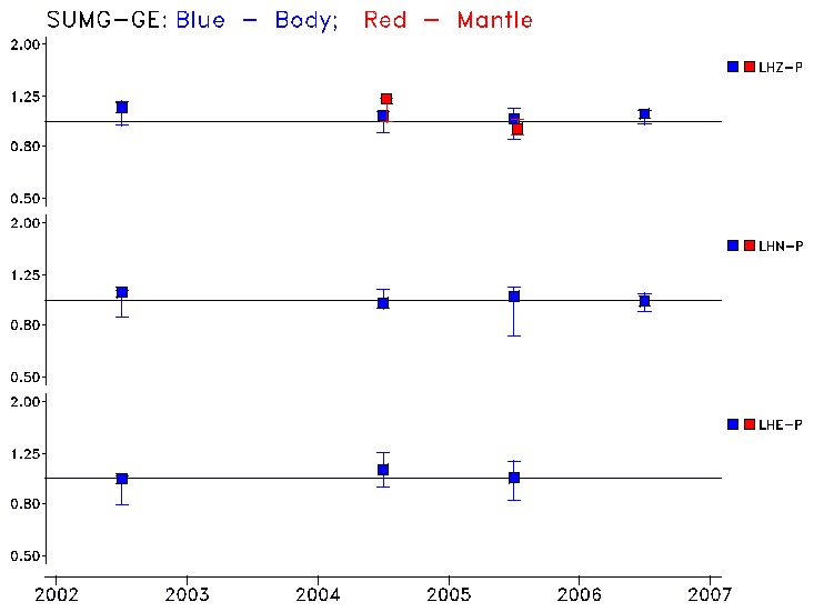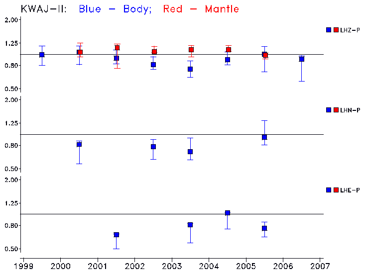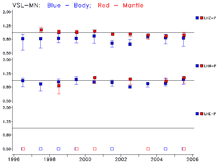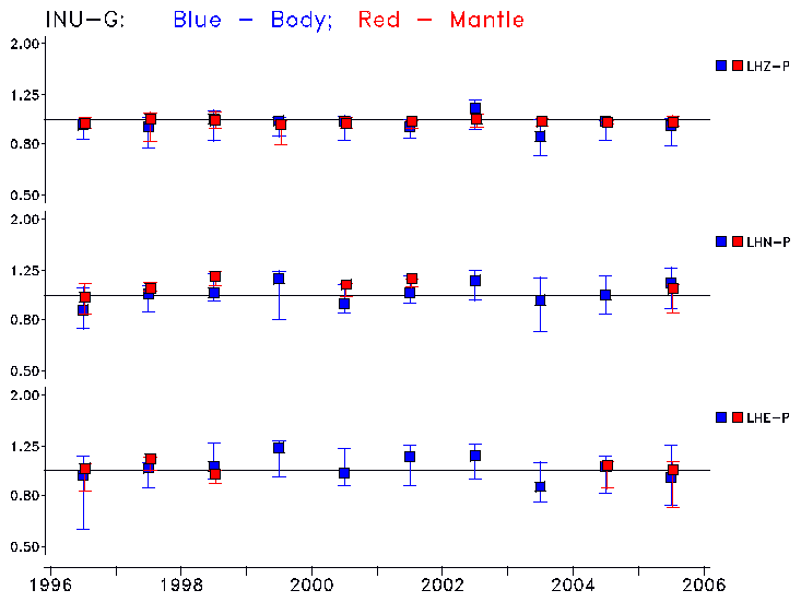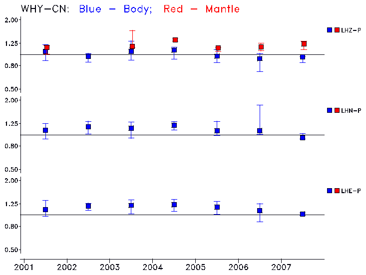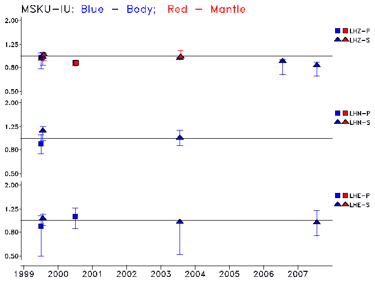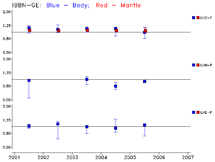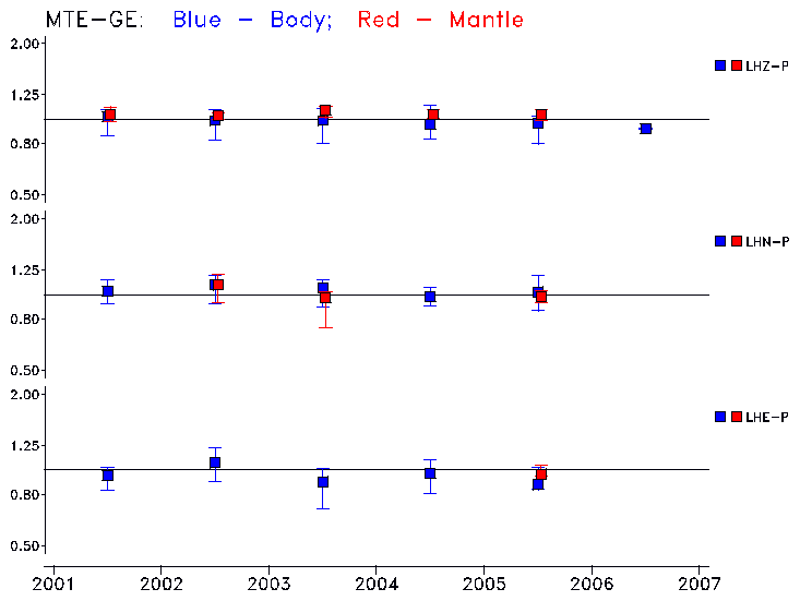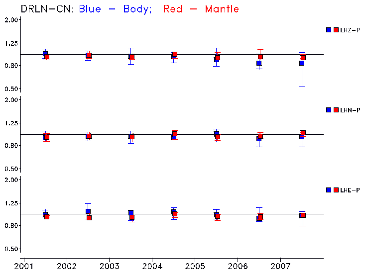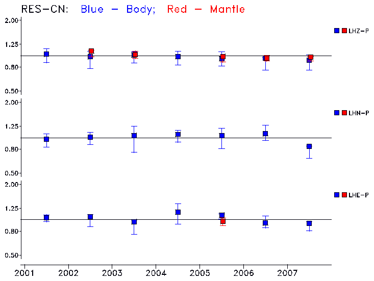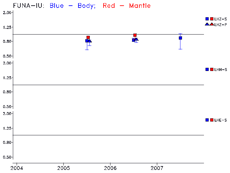 Earthquakes larger than M=6.5 are included in the analysis. Standard time windows are selected, and corresponding synthetic seismograms calculated For seismograms that have a correlation greater than 0.75, an optimal scaling factor (the factor by which the synthetic should be scaled to best match the observed seismogram) is calculated. A median scaling factor for each year is also calculated and displayed, together with limits for the two central quartiles.