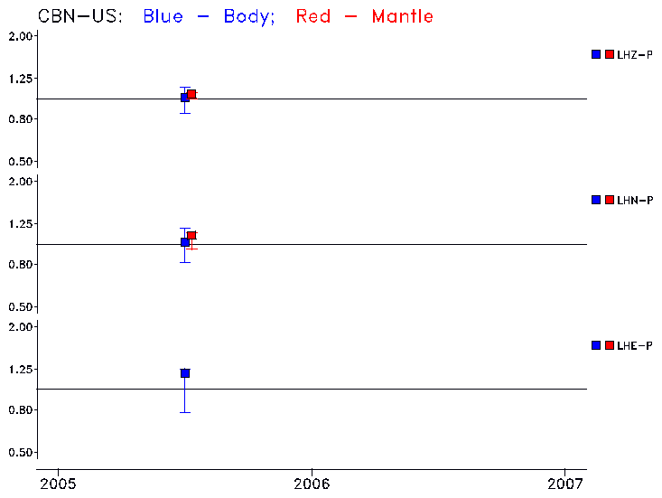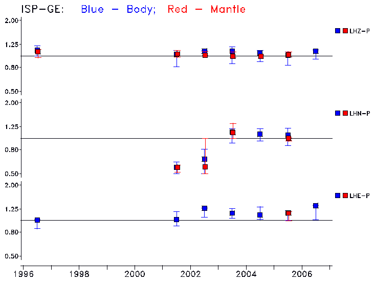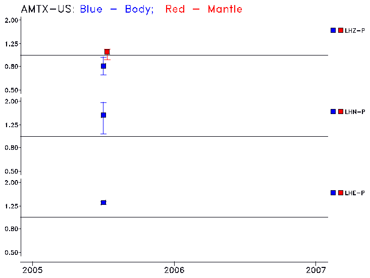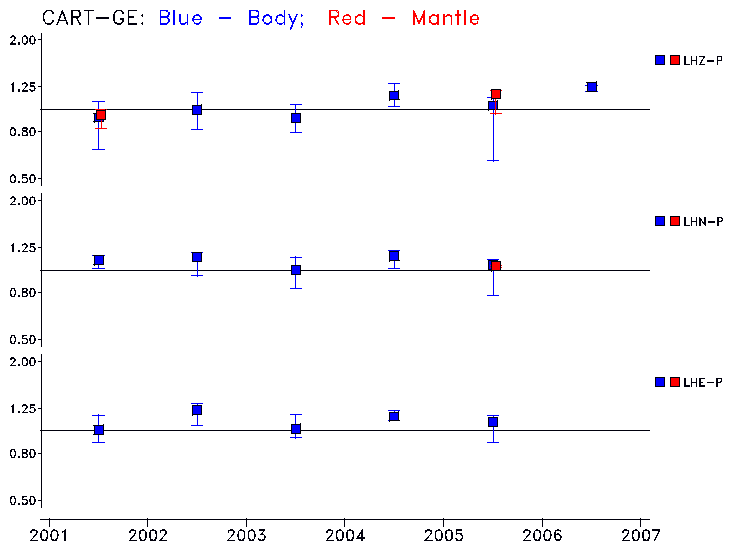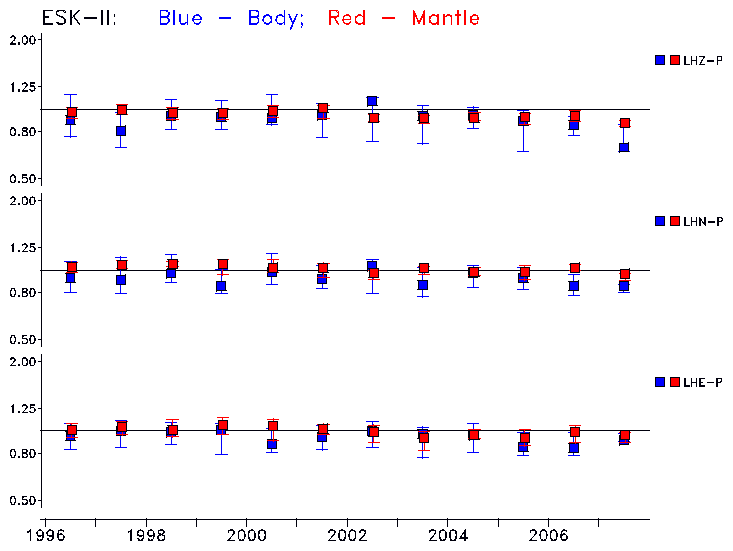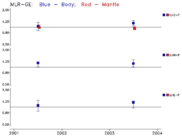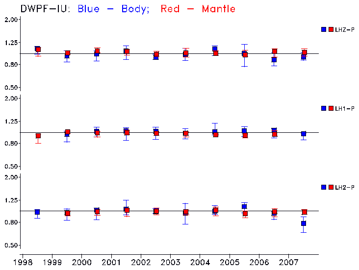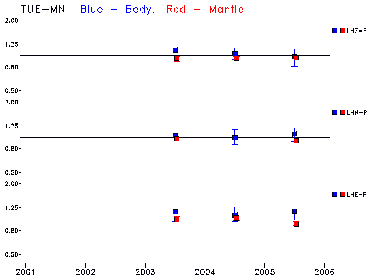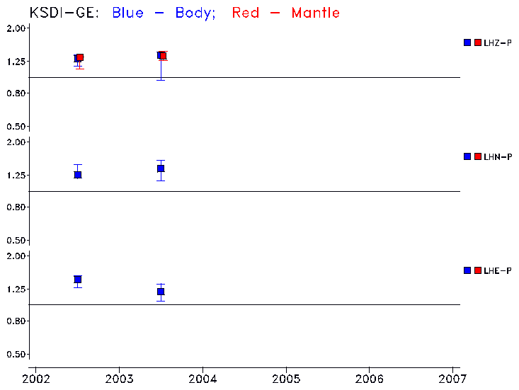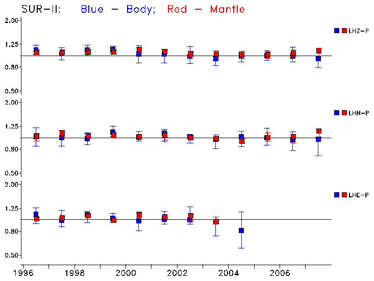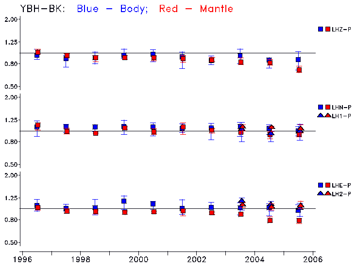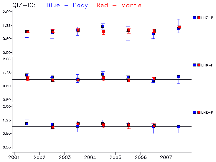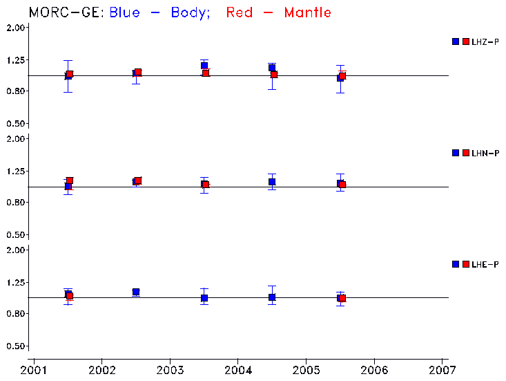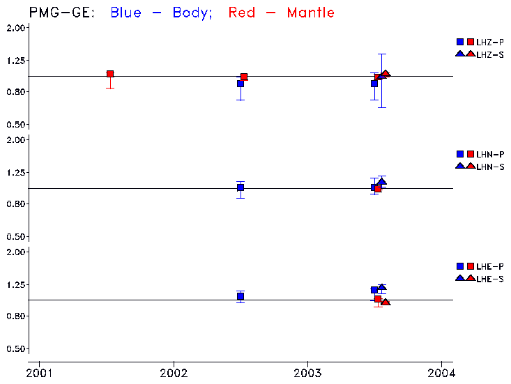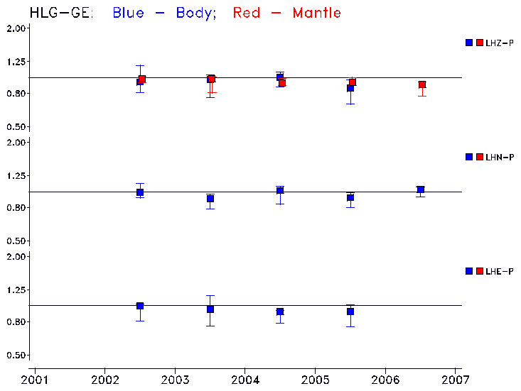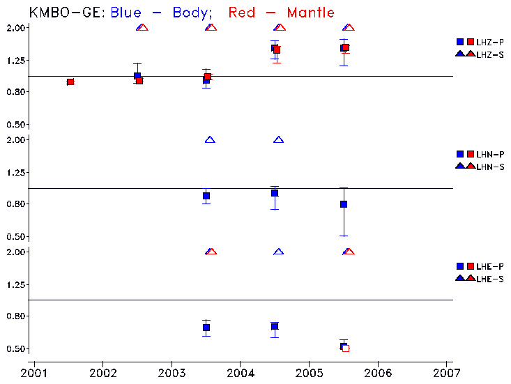 Earthquakes larger than M=6.5 are included in the analysis. Standard time windows are selected, and corresponding synthetic seismograms calculated For seismograms that have a correlation greater than 0.75, an optimal scaling factor (the factor by which the synthetic should be scaled to best match the observed seismogram) is calculated. A median scaling factor for each year is also calculated and displayed, together with limits for the two central quartiles.