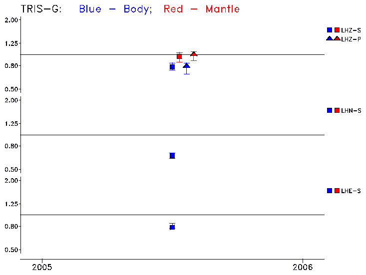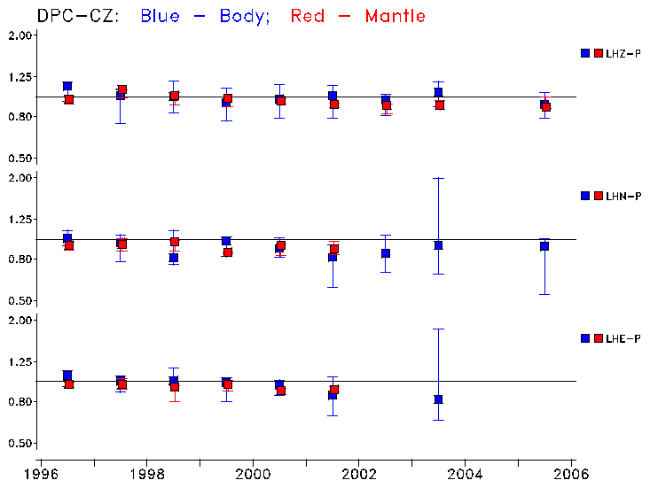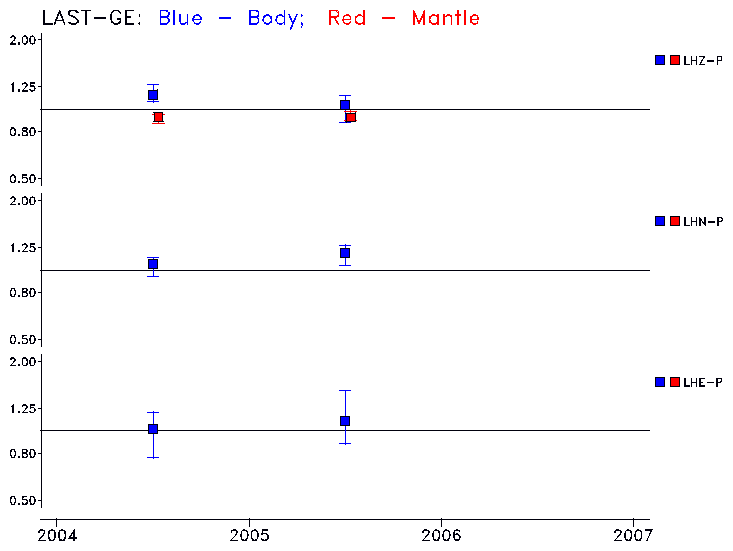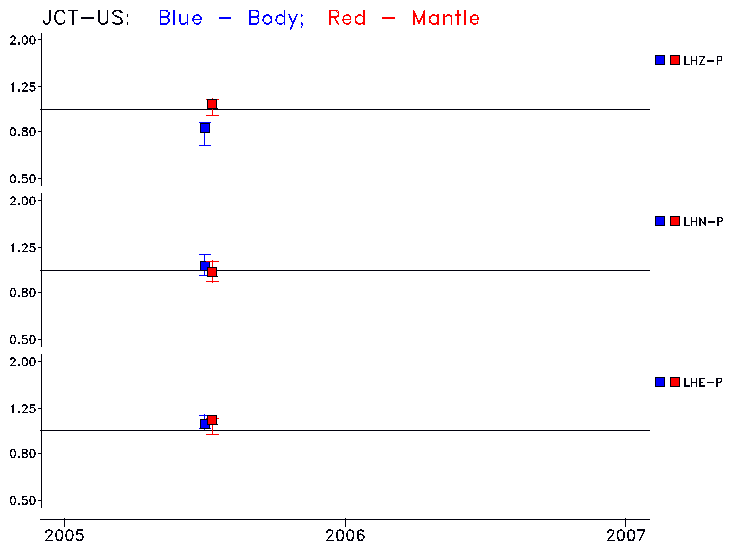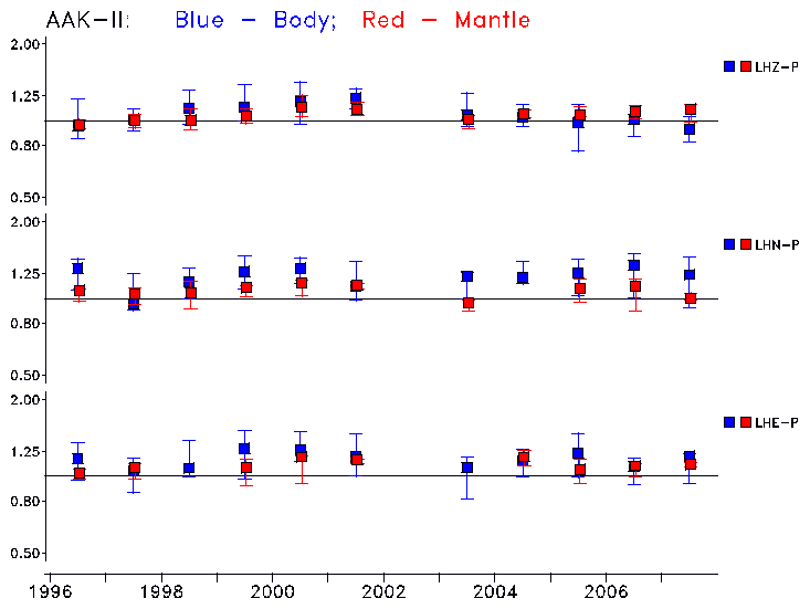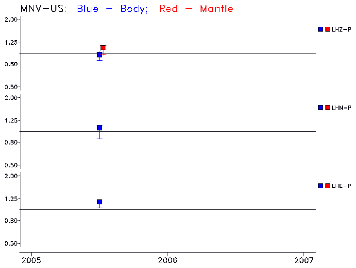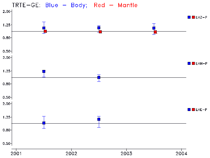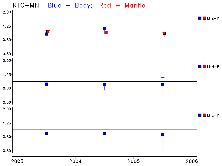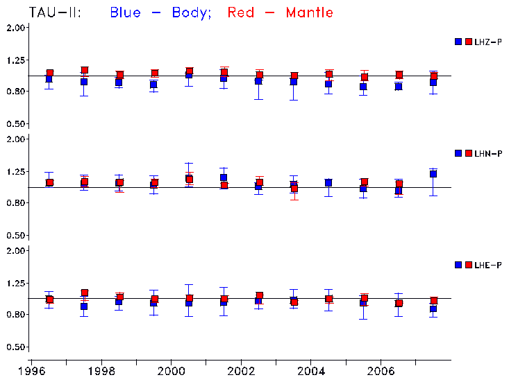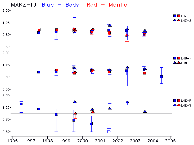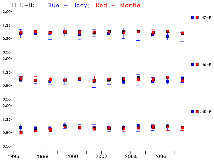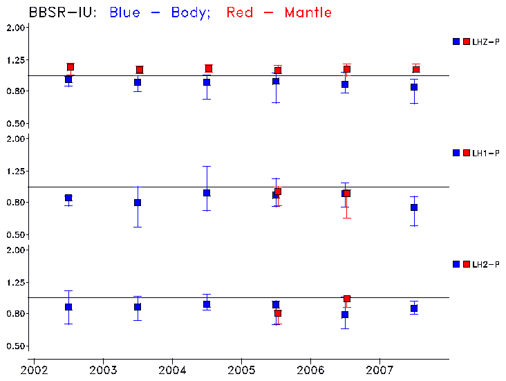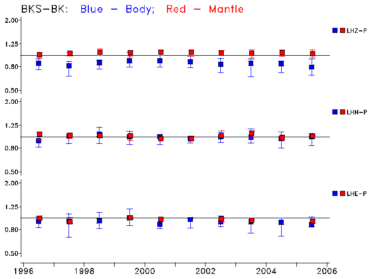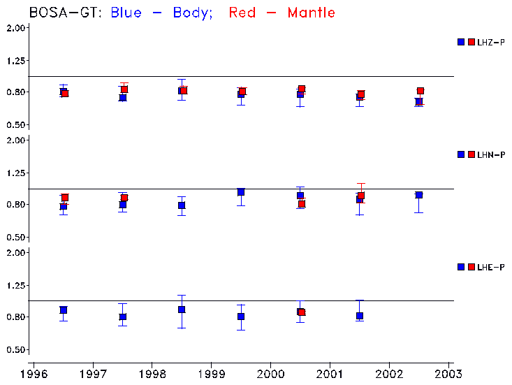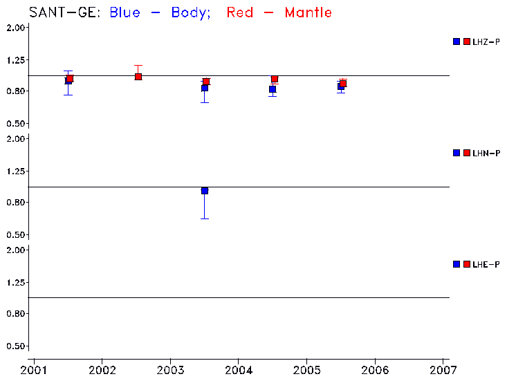 Earthquakes larger than M=6.5 are included in the analysis. Standard time windows are selected, and corresponding synthetic seismograms calculated For seismograms that have a correlation greater than 0.75, an optimal scaling factor (the factor by which the synthetic should be scaled to best match the observed seismogram) is calculated. A median scaling factor for each year is also calculated and displayed, together with limits for the two central quartiles.