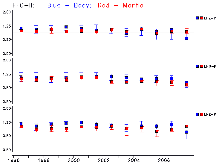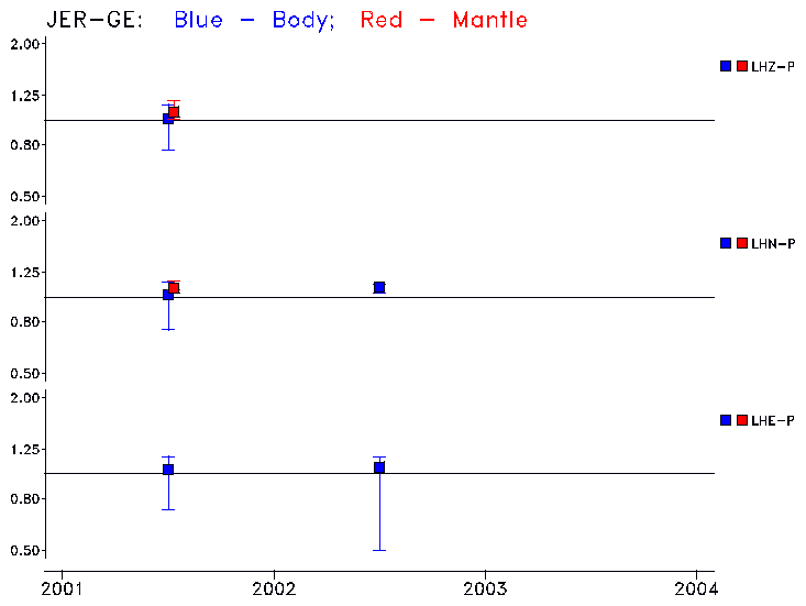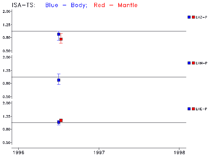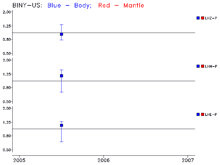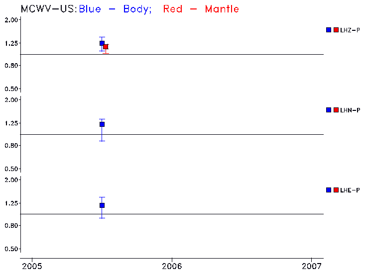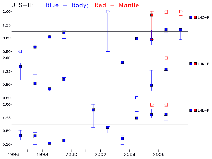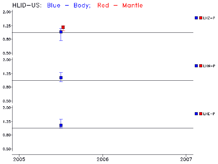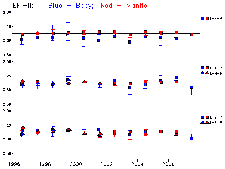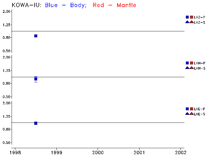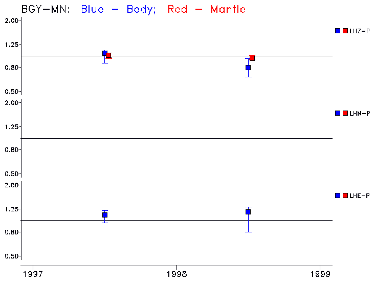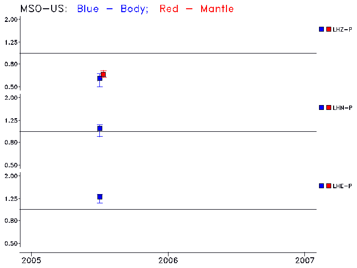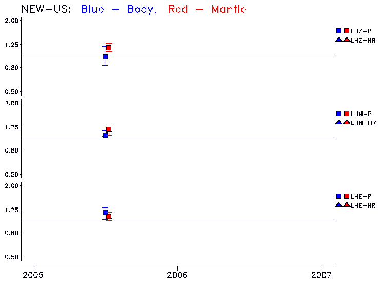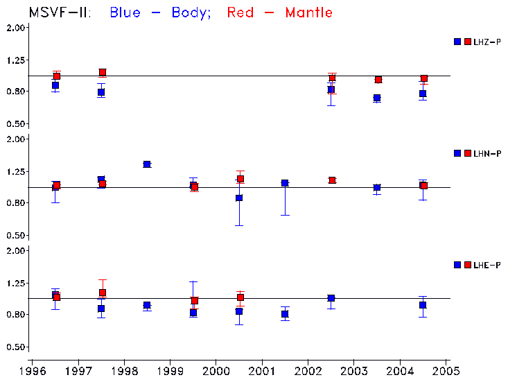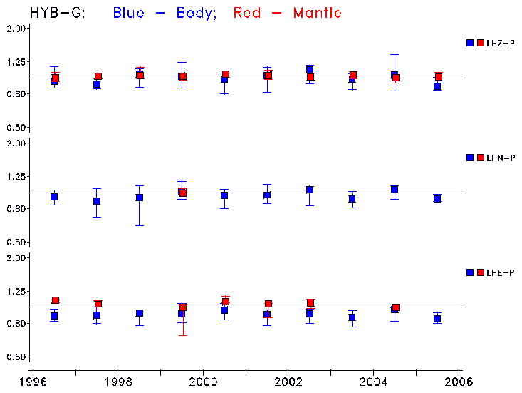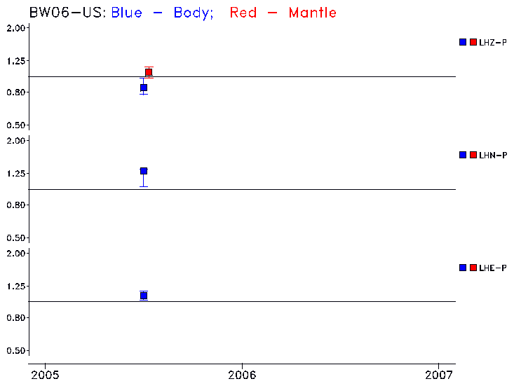 Earthquakes larger than M=6.5 are included in the analysis. Standard time windows are selected, and corresponding synthetic seismograms calculated For seismograms that have a correlation greater than 0.75, an optimal scaling factor (the factor by which the synthetic should be scaled to best match the observed seismogram) is calculated. A median scaling factor for each year is also calculated and displayed, together with limits for the two central quartiles.