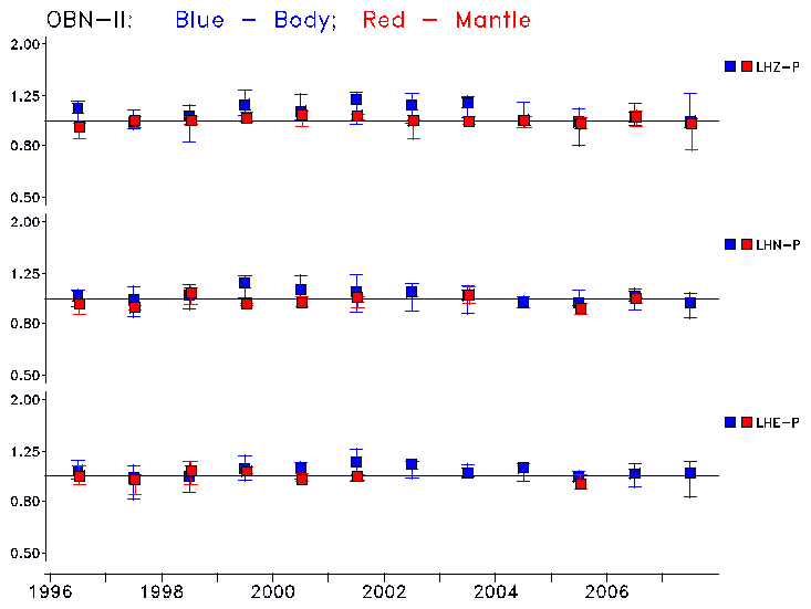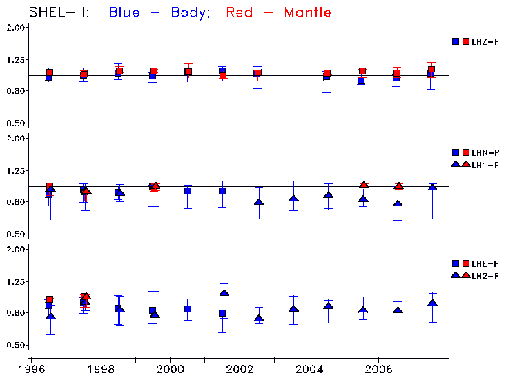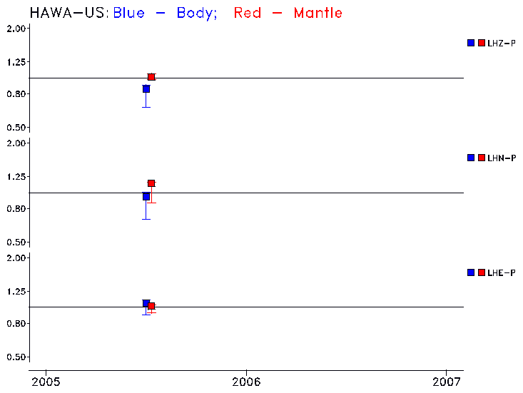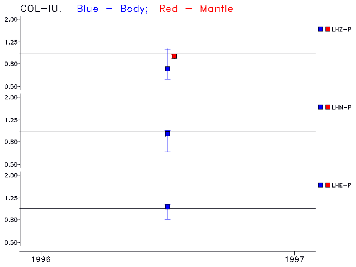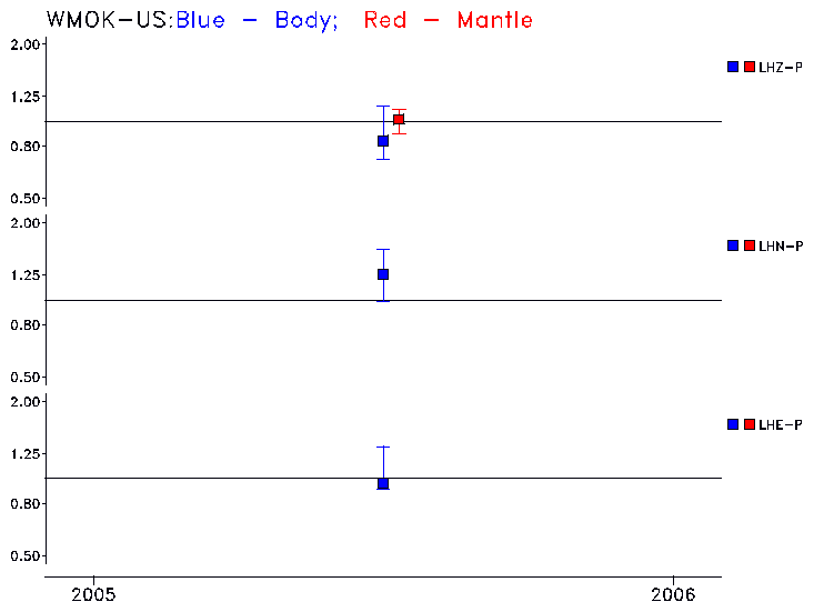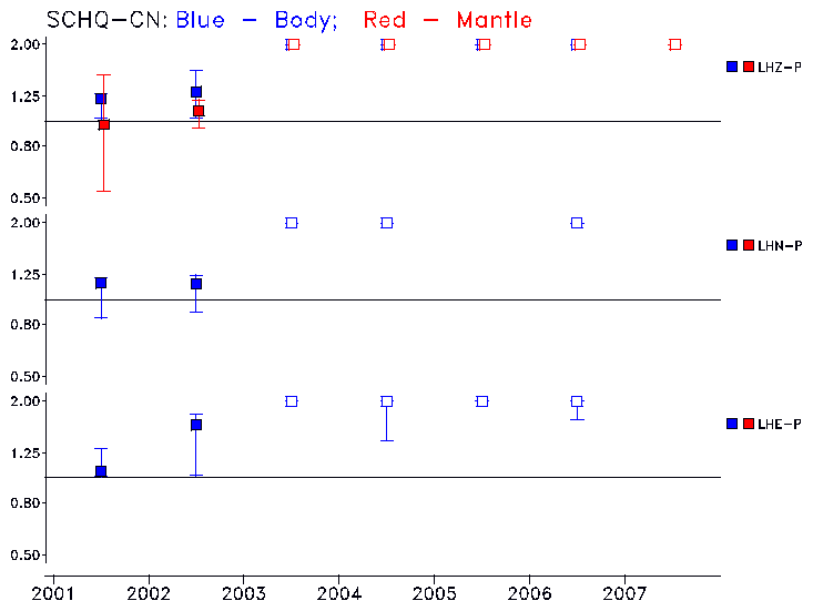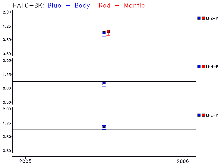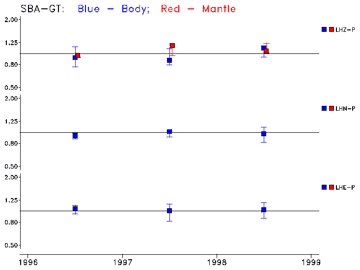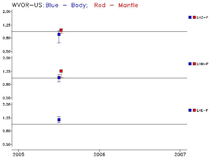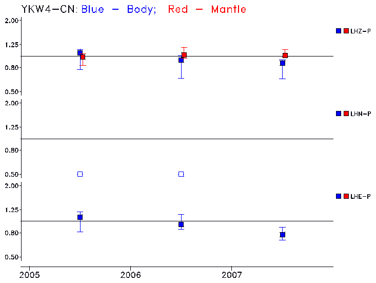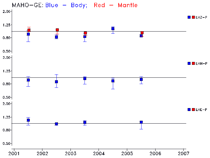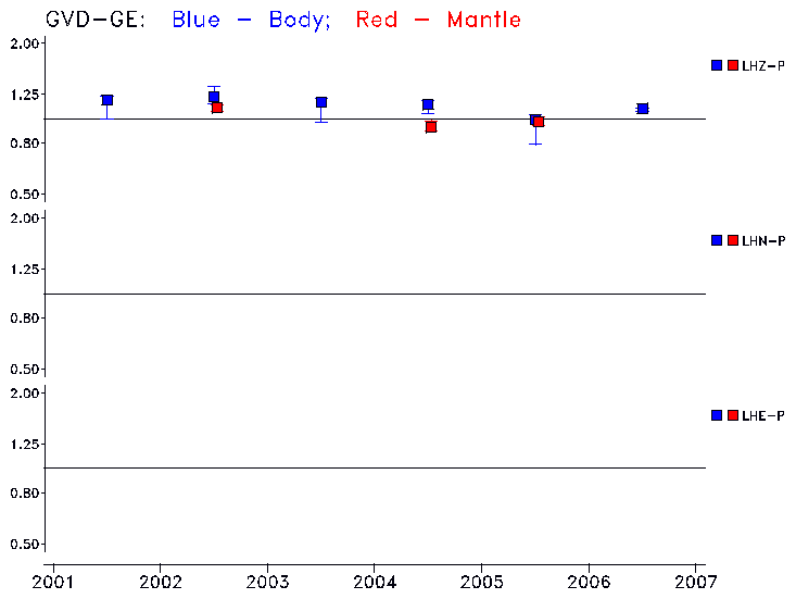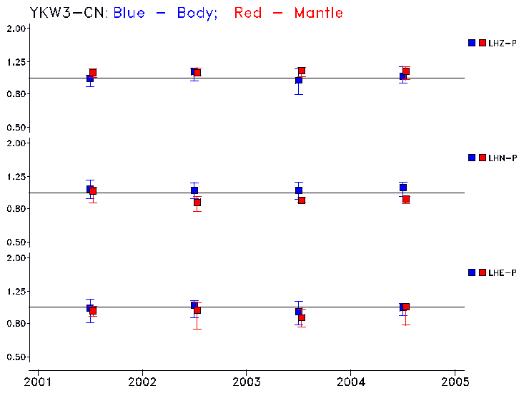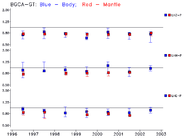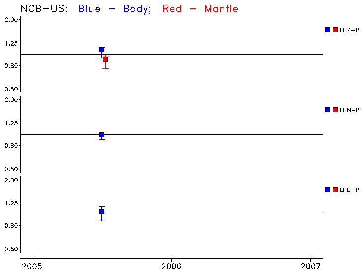 Earthquakes larger than M=6.5 are included in the analysis. Standard time windows are selected, and corresponding synthetic seismograms calculated For seismograms that have a correlation greater than 0.75, an optimal scaling factor (the factor by which the synthetic should be scaled to best match the observed seismogram) is calculated. A median scaling factor for each year is also calculated and displayed, together with limits for the two central quartiles.