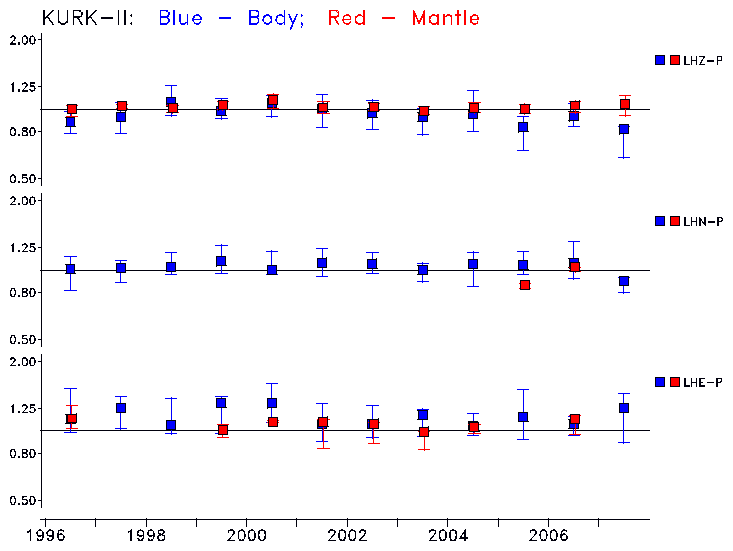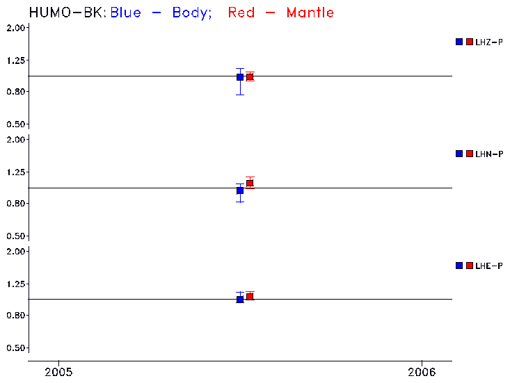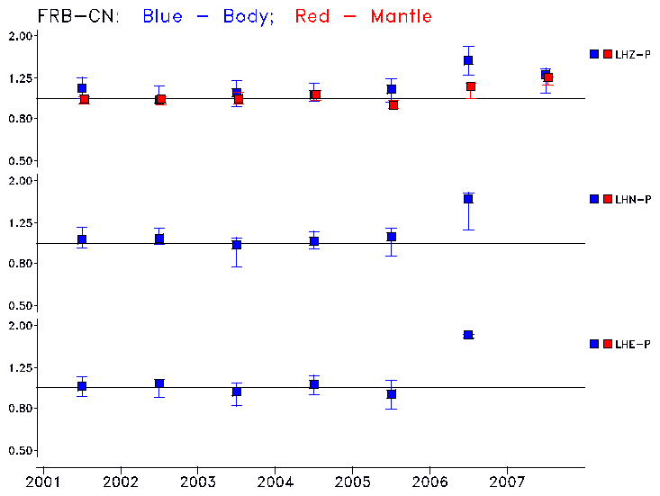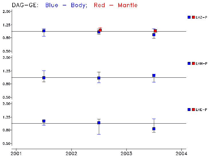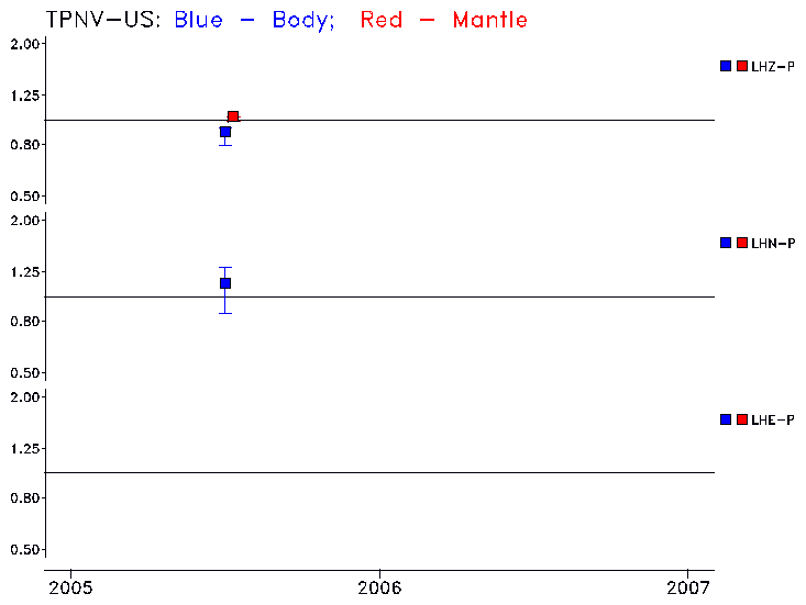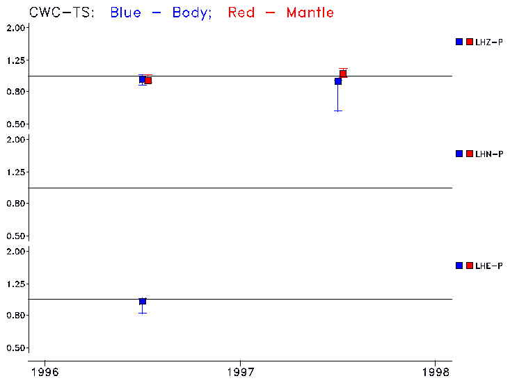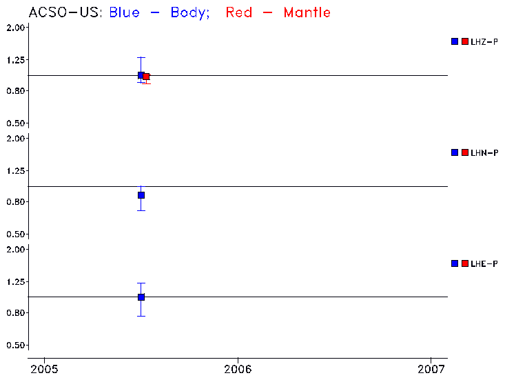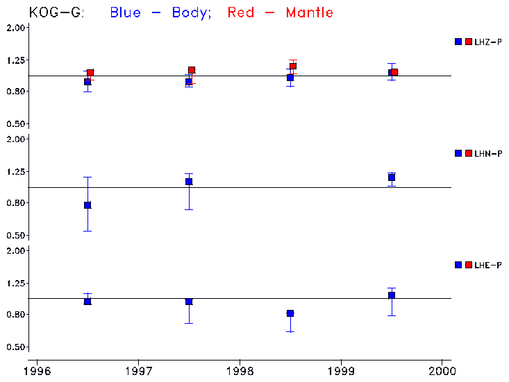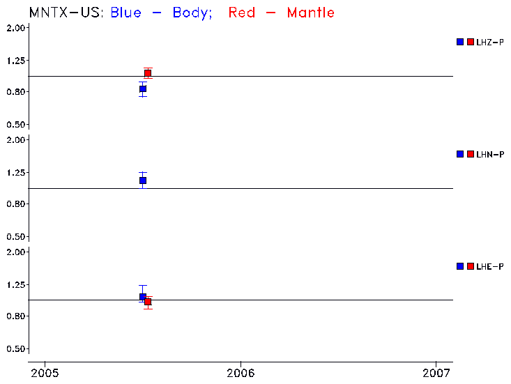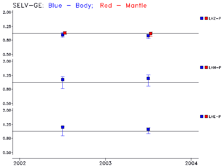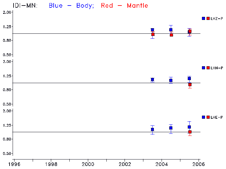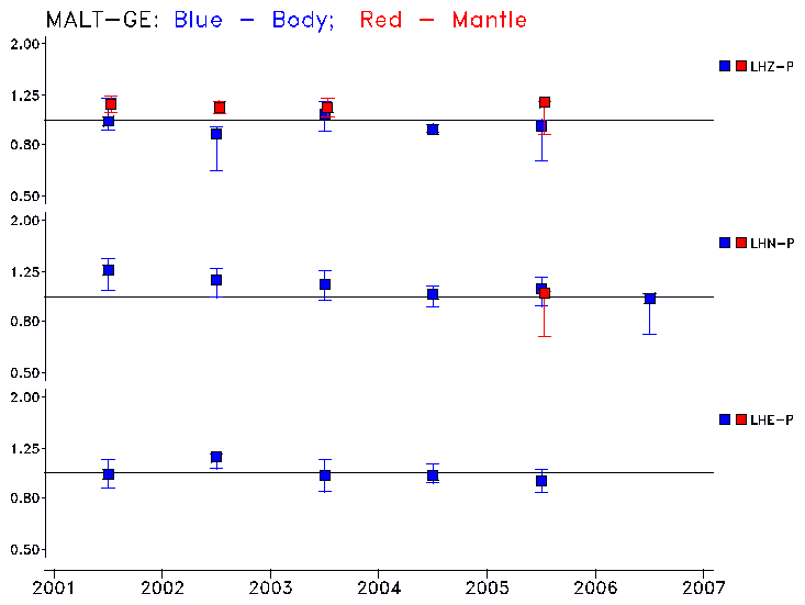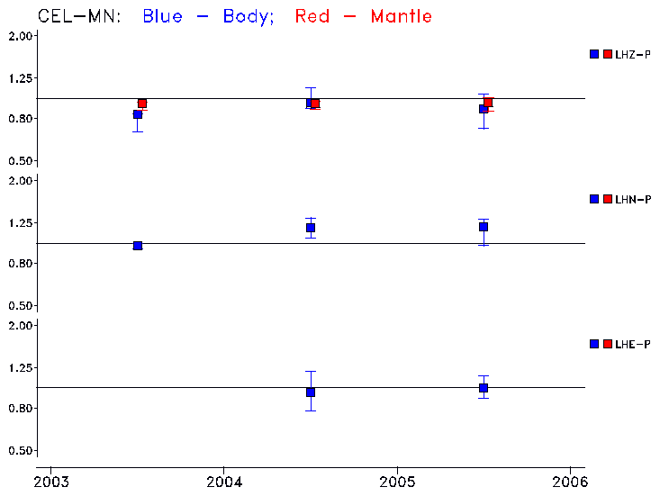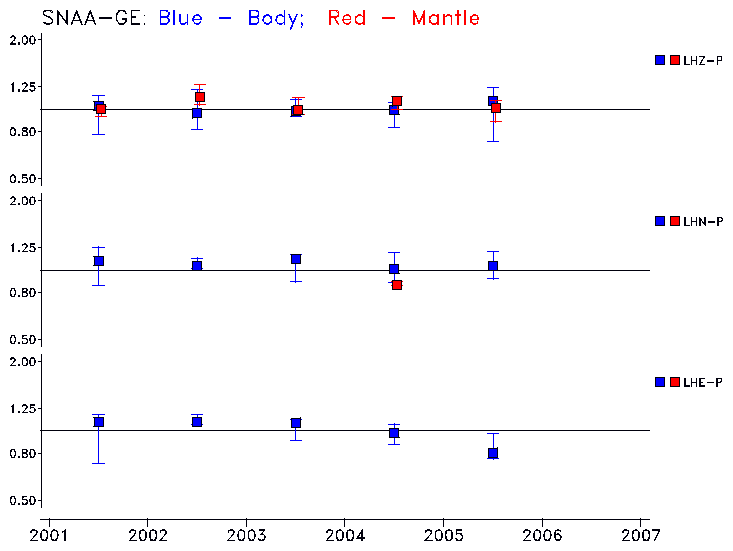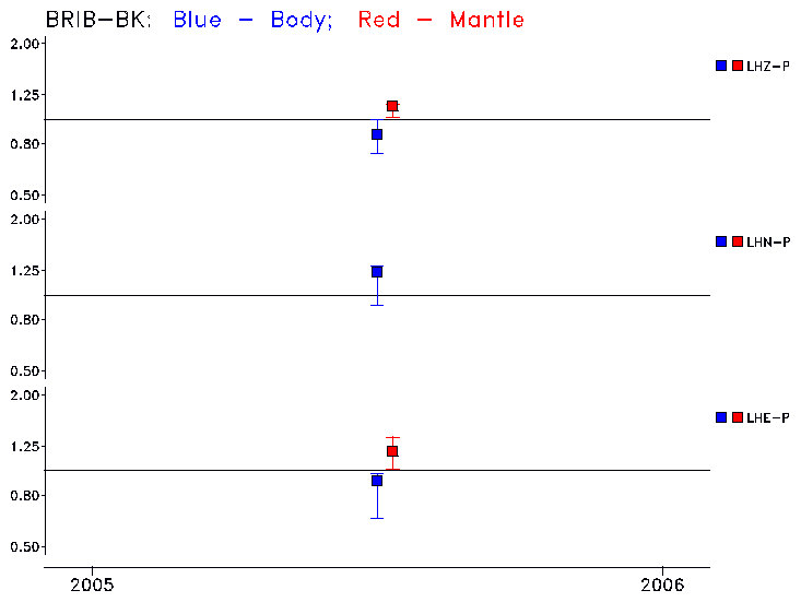 Earthquakes larger than M=6.5 are included in the analysis. Standard time windows are selected, and corresponding synthetic seismograms calculated For seismograms that have a correlation greater than 0.75, an optimal scaling factor (the factor by which the synthetic should be scaled to best match the observed seismogram) is calculated. A median scaling factor for each year is also calculated and displayed, together with limits for the two central quartiles.
