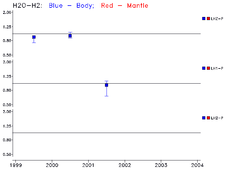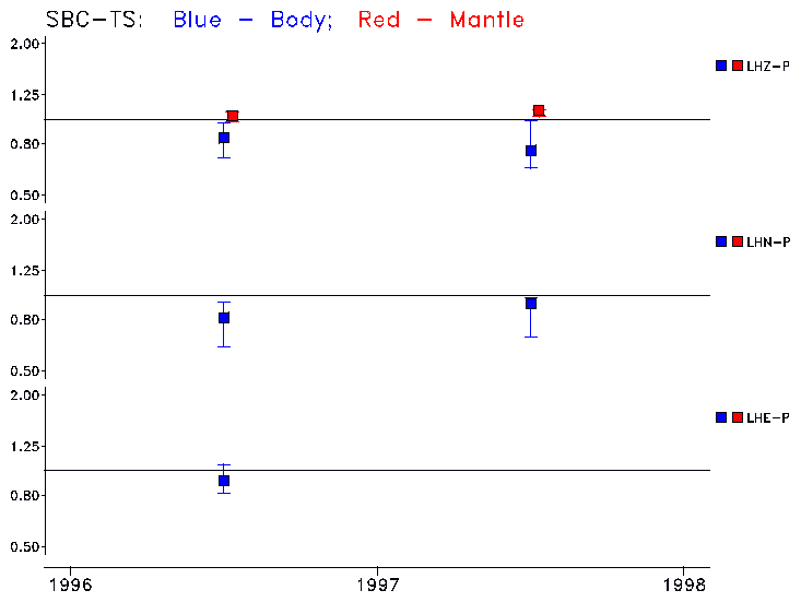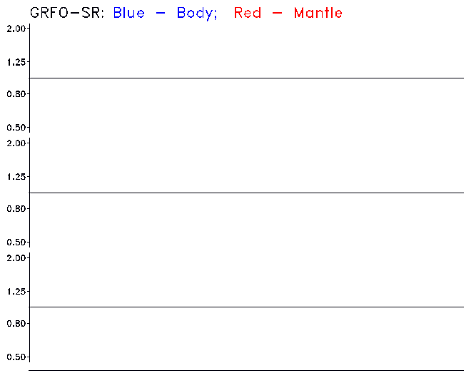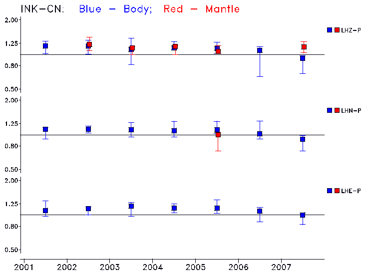 The vertical scale saturates at a factor of 2 (or 1/2). Open annual symbols indicate saturated values, i.e., that the scaling required is greater than a factor of 2