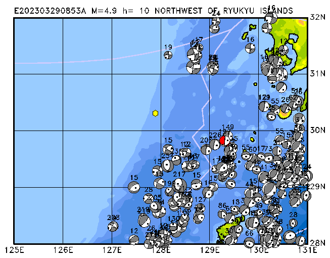 290 NORTHWEST OF RYUKYU ISLANDS PDEW h= 10 M=4.9 E202303290853A