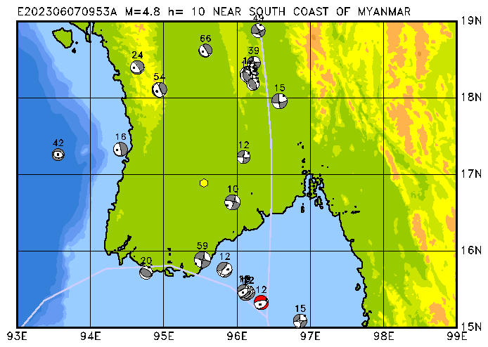 081 NEAR SOUTH COAST OF MYANMAR PDEW h= 10 M=4.8 E202306070953A