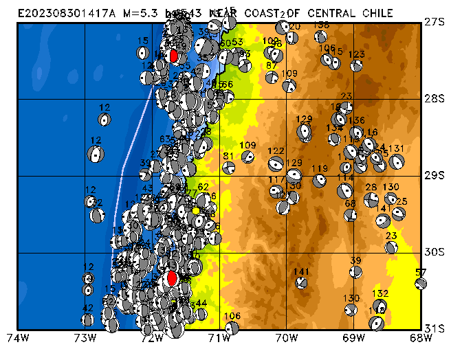 250 NEAR COAST OF CENTRAL CHILE PDEW h= 43 M=5.3 E202308301417A
