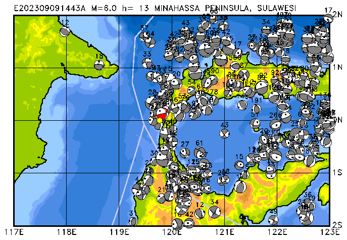 094 MINAHASSA PENINSULA, SULAWESI PDEW h= 13 M=6.0 E202309091443A