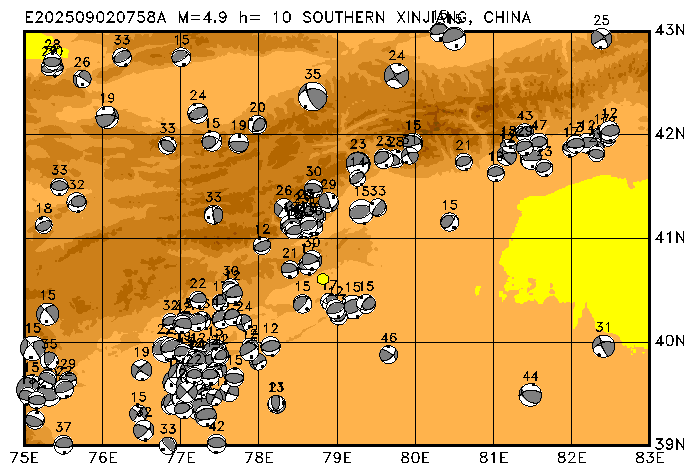 014 SOUTHERN XINJIANG, CHINA PDEW h= 10 M=4.9 E202509020758A