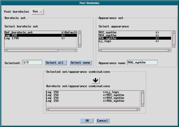 - To post the boreholes, the procedure is similar as in basemap: select 'Post/Boreholes...' to bring up a 'Post Boreholes' window identical to the one in basemap. Select the borehole set(s), the vertical appearance that you have defined, press the arrow to validate your selection - and 'OK' to close.