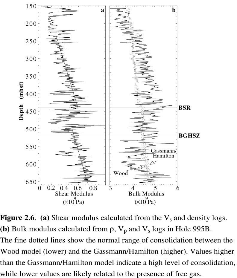 We calculate the predictions of the Wood and Gassmann/Hamilton models at Site 995 to define an expected range of compressibility for the Blake Ridge sediments. In normal sediments, the degree of consolidation may be indicated by the closeness of the measured bulk modulus to either the Wood (unconsolidated) or Gassmann/Hamilton (consolidated) model [Guerin and Goldberg, 1996]. Because these sediments were deposited extremely quickly [Paull et al., 1996], their porosity is very high and the range between these two models is particularly narrow. This is illustrated by the very narrow range between the two fine dotted lines in Figure 2.6, representing respectively Wood's and Gassmann/Hamilton's models.