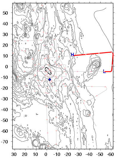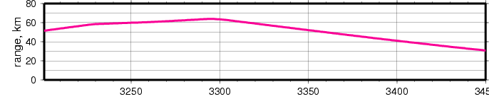 Pn seems to emmerge from high side near shot 3360. Appearent velocity of Pn is ~8.05 km/s over flat terrain.