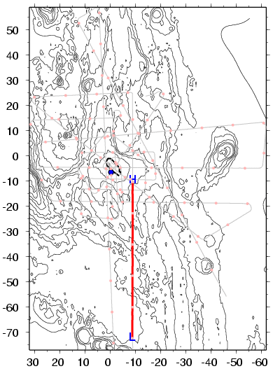 faint PmP pinch out visible near 1640 (30 km).
