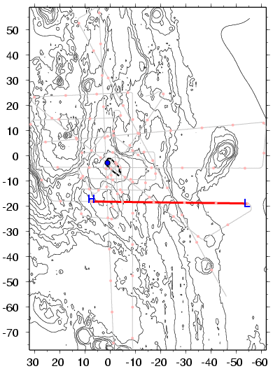 shots 2730-2750 display a characteristic seen in the synthetics over high f jagged topography. The first arrival is clear but the second cycle is rough.