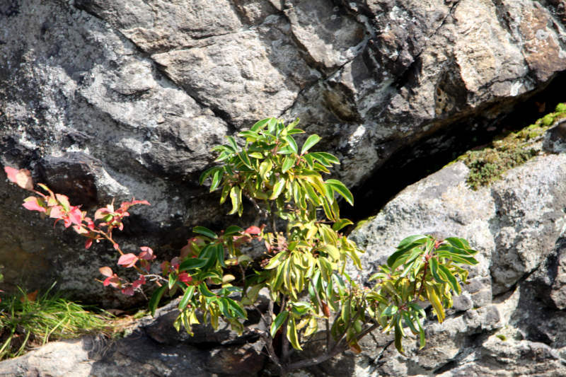Blueberries and mountain laurel, growing from a crack in the rocks