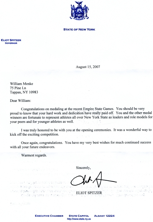 Congradulatory letter to me from Gov. Spitzer