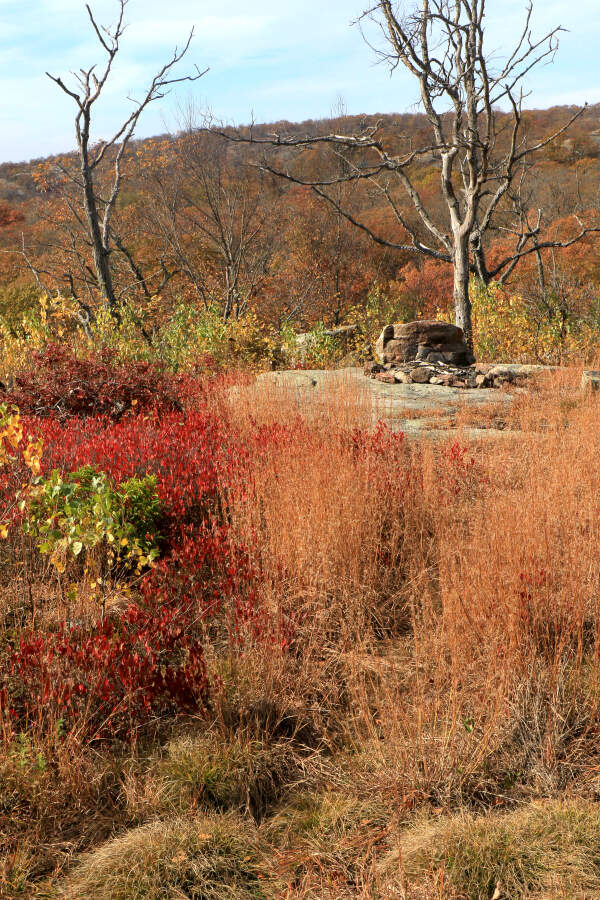 Fire ring, atop a hill near the northeastern shore of Pine Meadow Lake
