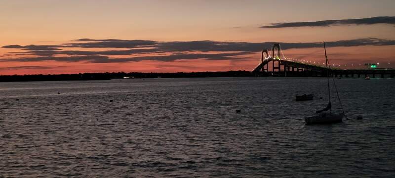 Newport Harbor and the Claiborne Pell Bridge at dusk, as seen from Fort Greene, Newport, Rhode Island