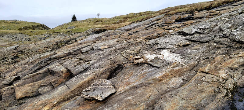 Phyllite rock pavement, shore of Lochan (small lake) Breaclaich, Killin, Scotland