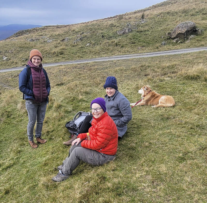 Katie Hood (left), Dallas Abbott, Hannah Menke and Estel-the-dog, shore of Lochan (small lake) Breaclaich, Killin, Scotland