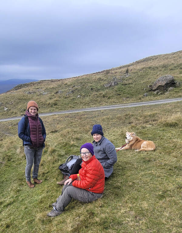 Katie Hood (left), Dallas Abbott, Hannah Menke and Estel-the-dog, shore of Lochan (small lake) Breaclaich, Killin, Scotland