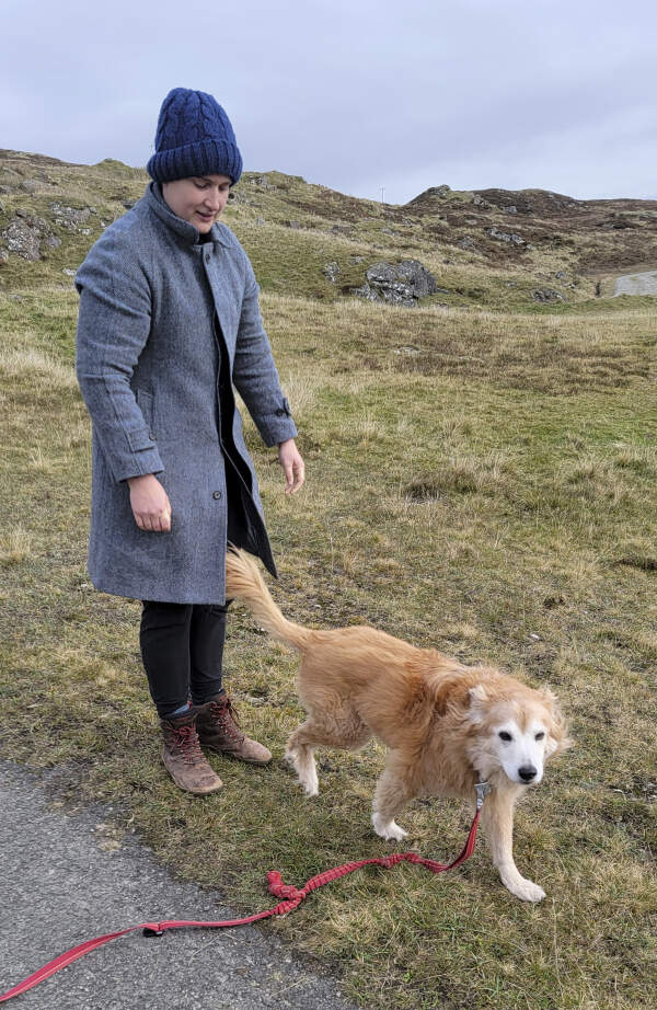 Hannah Menke and Estel-the-dog, shore of Lochan (small lake) Breaclaich, Killin, Scotland
