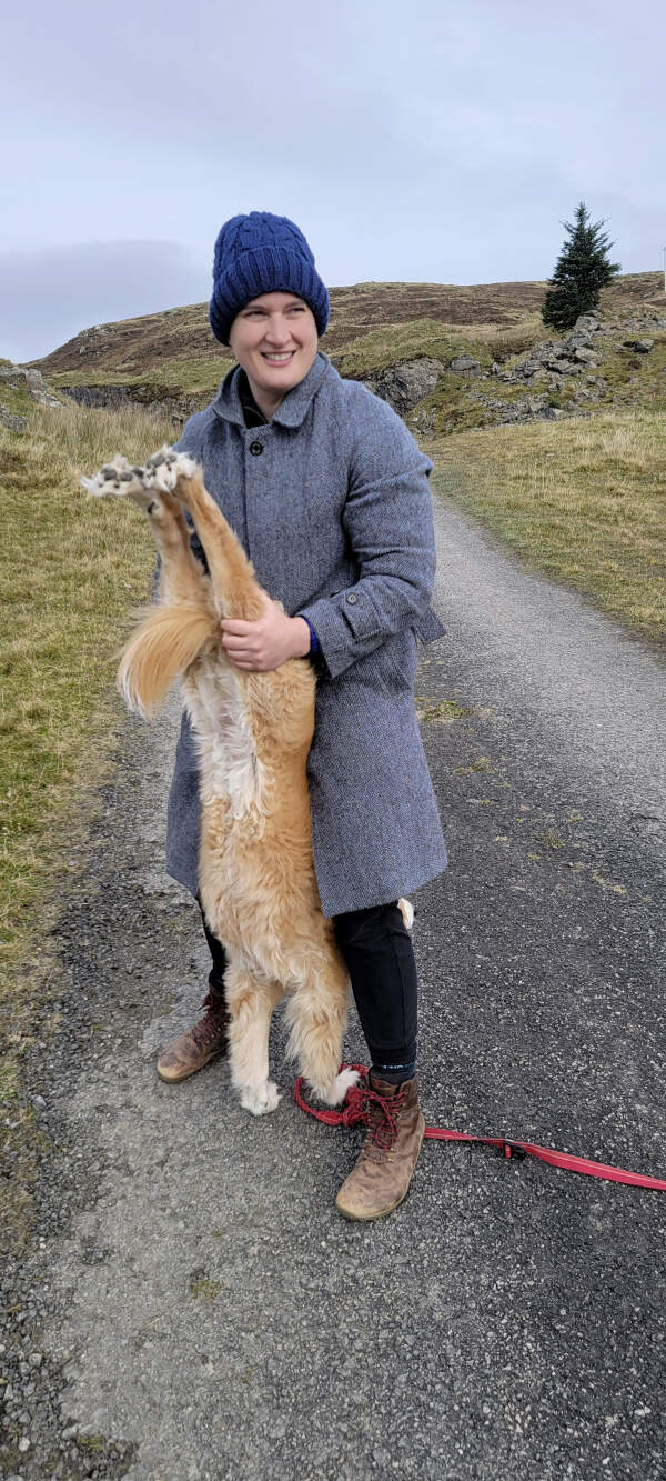 Hannah Menke stretching Estel-the-dog, along Rob Roy Way, Killin, Scotland