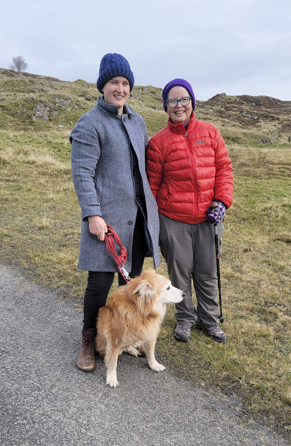 Hannah Menke (left), Dallas Abbott and Estel-the-dog, along Rob Roy Way, Killin, Scotland