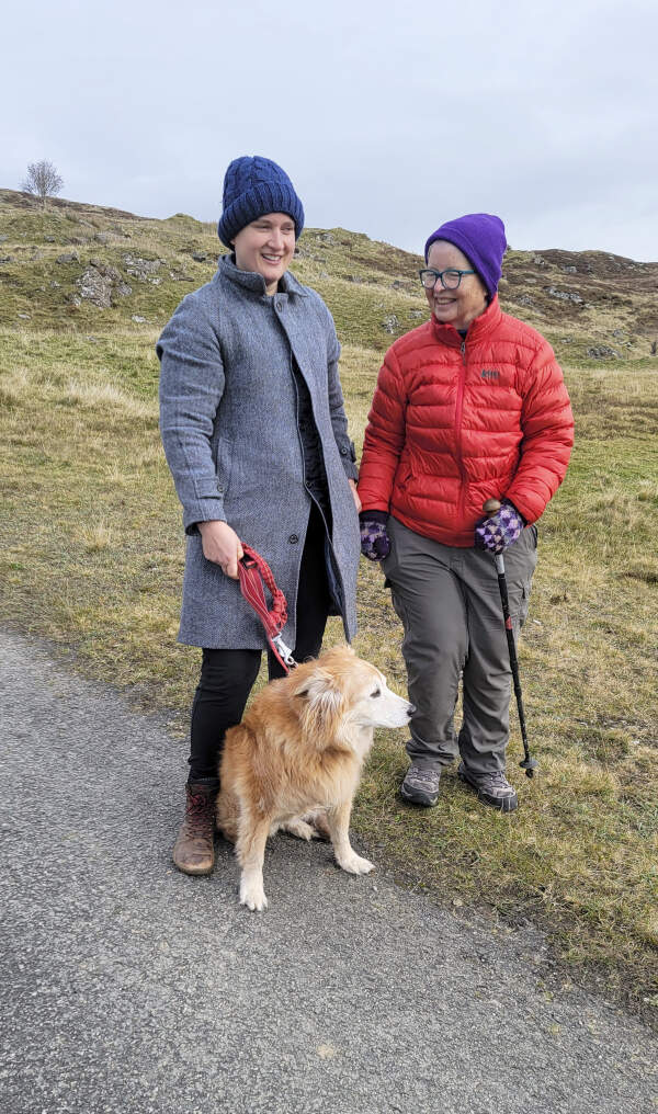 Hannah Menke (left), Dallas Abbott and Estel-the-dog, along Rob Roy Way, Killin, Scotland
