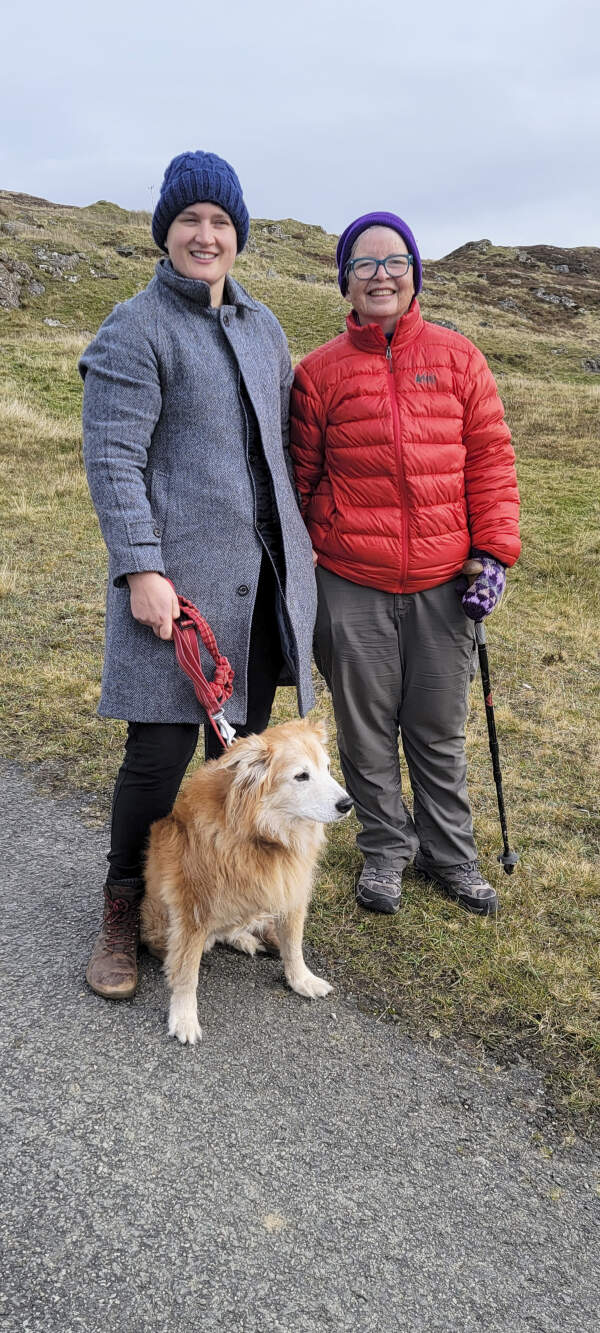 Hannah Menke (left), Dallas Abbott and Estel-the-dog, along Rob Roy Way, Killin, Scotland